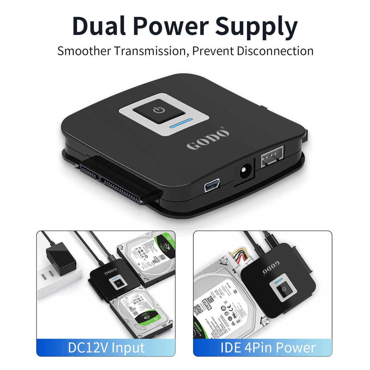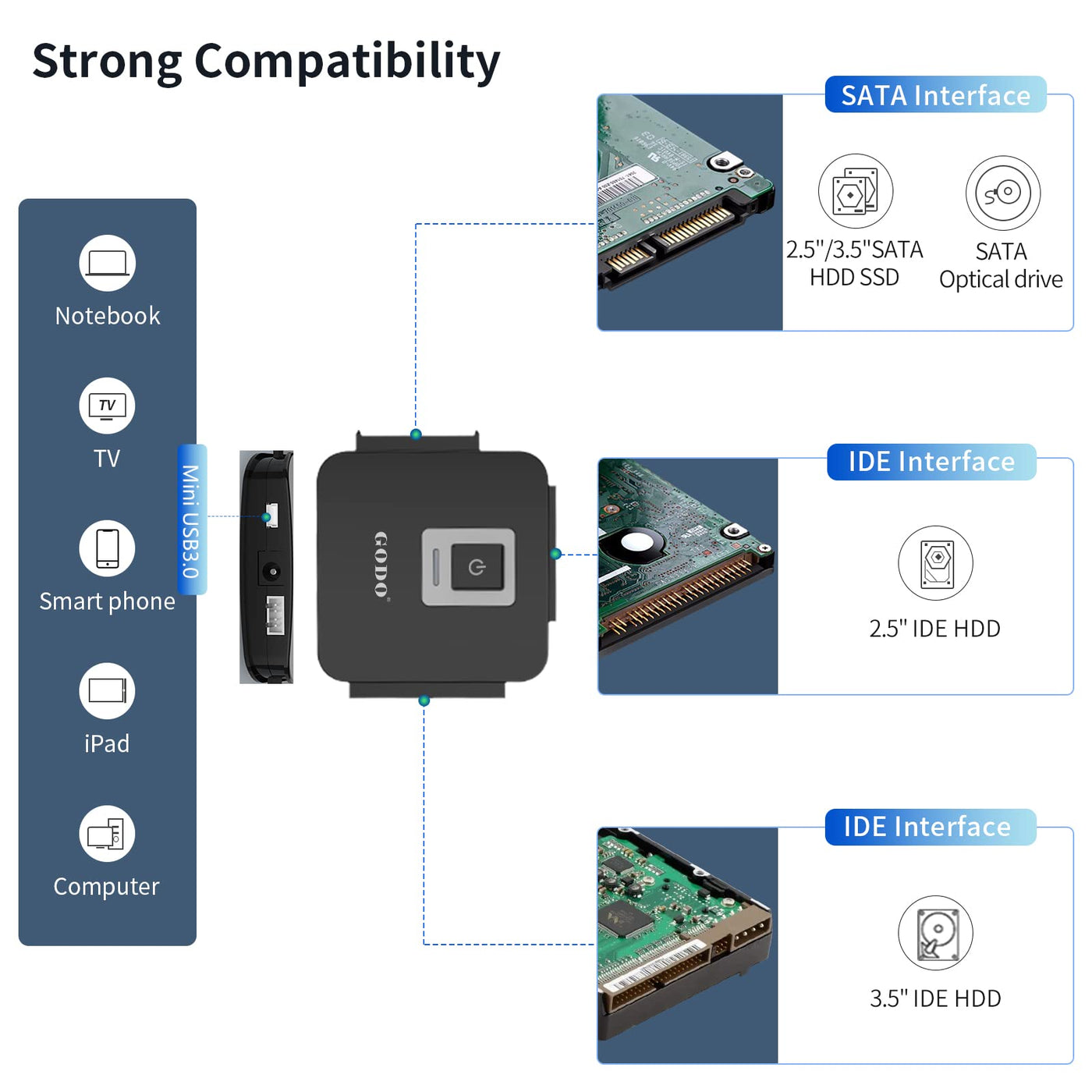 Godo Usb 3.0 To 2.5'' 3.5'' Sata & Ide Hdd Ssd External Hard Drive Adapter Specification -Universal Usb 3.0 To Ide/Sata Converter With 3 Connectors -Supports 2.5 Inch/3.5 Inch Ide/Sat/Ssd Hard Disk Drives And 5.25 Inch Sata Cd/Dvd Drives -Ultra Fast Speed From Usb 3.0 To Usb 2.0/1.1,Transmission Rate Up To 5Gbps -Supports Drives With A Capacity Of Up To 6Tb -Hard Disk Protection On / Off Switch -Led Activity Indicator, Plug & Play, Simple, Reliable And Stable Why The Cable Does Not Work With My Drives ( The Ssd Is Not Recognized With The Cable)? Possible Reasons: * Make Sure Correct Installation And Good Usb Connection. And Try Other Usb Port If Needed * If You Install A Brand-New Hdd Or Ssd, You Need To Initialize It By System Disk Management Tool * If You Install A Problematic Or Disassembled Hard Disk, It Might Be Broken Physically And Can Not Work * If It Is An Apple Os Mac System, Set Up The Hard Disk Format * Wrong Hard Drive Type - This Cable Will Not Work With 3.5'' Ssd/Hdd * Bad Usb Port On The Computer
