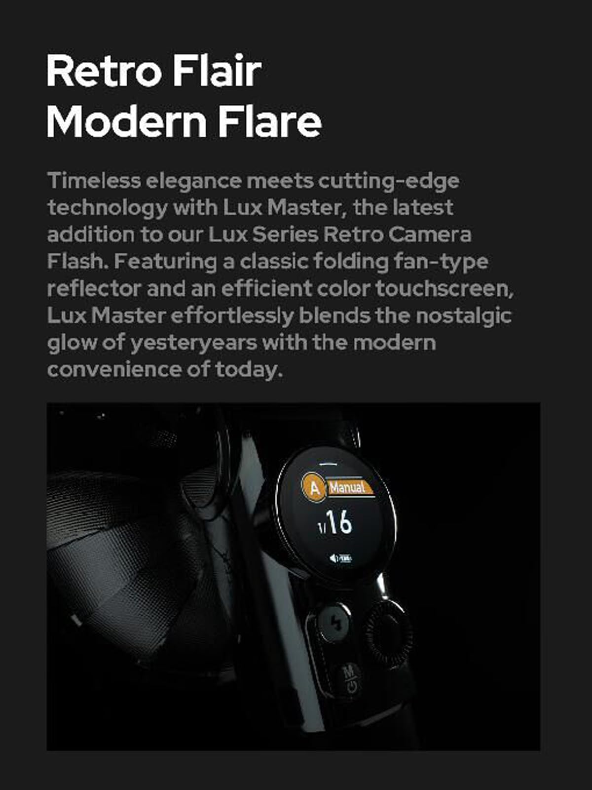 Timeless Elegance Meets Cutting-Edge Technology With Lux Master, The Latest Addition To Our Lux Series Retro Camera Flash. Featuring A Classic Folding Fan-Type Reflector And An Efficient Color Touchscreen, Lux Master Effortlessly Blends The Nostalgic Glow Of Yesteryears With The Modern Convenience Of Today. Gn(1/1 Step) Gn25( Is0100, In Meters ) Lithium Battery Parameters Dc7.2V, 2980Mah, 21.456Wh Input Parameters 5V?2A Charging Time 2H(5V/2A) Cct Of Flash Head 6000K?300K Flash Output Power In M Mode 1/1 -1/256 ( With +0.1 Increment Each Step ) Or 10 -2.0 ( With +0.1 Increment Each Step ) A (Auto) Flash Mode Parameters Of Cameras Are F2.8 And Is0100 By Default Photocell S1 Photocell /S2 Photocell 2.4G Wireless Channels 1-32 2.4G Groups A,B,C,D,E 2.4G Wireless Id Off,1-99 2.4G Wireless Transmission Distance Max. 100M Sync Mode First-Curtain Sync, Second-Curtain Sync,High-Speed Sync (Available In Separately Sold Flash Tigger) Flash Head Rotatable Angle 0-90 ( Four Angles With +30 Increment Each ) Working Environment Temperature -10C~50C Recycle Time(1/1 Step) 1.8S Full Power Flash Times(1/1 Step ) 460 Battery Charging Temperature 0C-45C Sync Triggering Sync Cord Dimension (With Reflector) 5.51*10.24*3.90 Net Weight (With Reflector) 470G