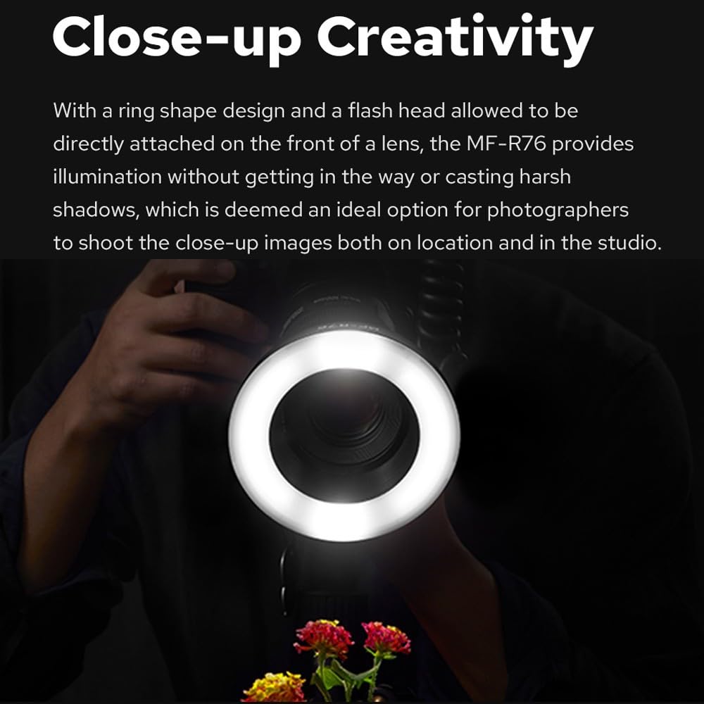 Godox Mf-R76 Macro Ring Flash Combines Ingenious Design, Powerful Performance, And A Wide Range Of Uses. It Supports Independent Ab Lamp Flashing, 10-Level Brightness Adjustment, And Precise Setting Of Flash Power Output. It Is Very Suitable For Insect Photography And Oral Dentistry. Photography, Jewelry Photography And Other Scenes Can Provide You With More Professional Macro Photography Solutions.Specification: Model :Mf-R76 Gulde No : Gn14/46(Iso 100, In Meter/Feet) Compatible Cameras: Canon, Nikon, Sony, Fuji, Olympu Panasonic. Pentax Battery: 7.2V/2600Mah Flash Power(/1 Power Output): 76W Focus Assist Beam Power: O.7W*2 Focus Asslst Beam Cct: 5000K Flash Power Range: 71-1/128(With 1/3 Increment At Each Stop) Flash Duration1/300S~1/20000S Inner Diameter Of Light Body: 77Mm Recycle Time: 0.1-1.5S Full Power Flashes: 660 Times Working Environment Emperature :-10C-50C Ring Flash Dimension: 30*130*27Mm/51*5.1*1 Inches Controller Dimension:120*70*50Mm/4.7*2.7*1.9 Inches Net Weight: 458G/16.1 Oz Net Weight(Wlth Battery): 577G/20.3 Ozpackage Including:1*Godox Mf-R76 Micro Ring Flash1*Usb Charge1*Type-C-Usb1*Charging Cable1*Lithium Battery1* Adapter Rings X8