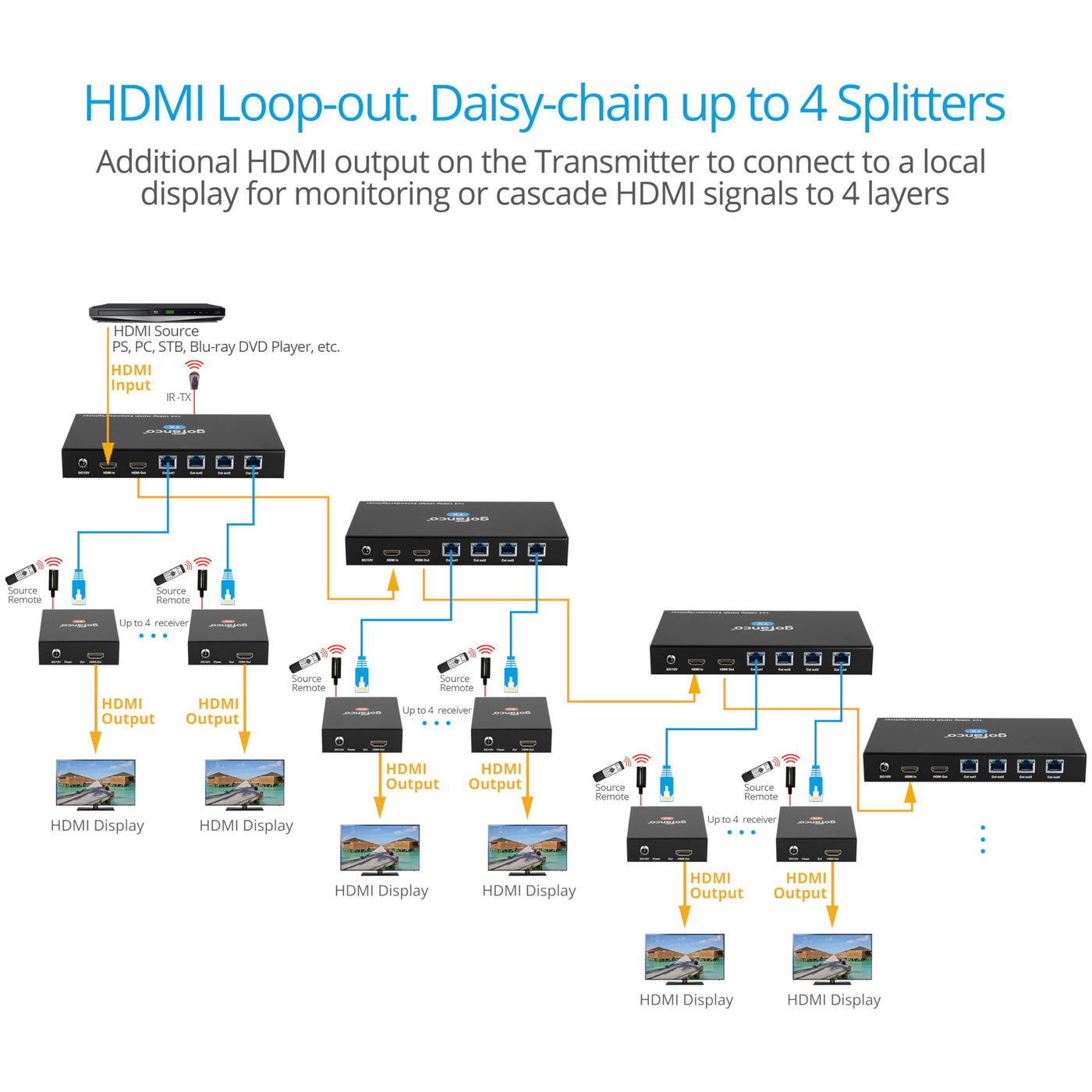 Gofanco Prophecy 4-Port Hdmi Extender/Splitter Over Cat5E/6/7 With Loopout - 50M Extends Uncompressed Hdmi Audio/Video Signals Over Cost Effective Cat5E/6/7 Cabling, While Maintaining Signal Strength And Lossless Video. An Hdmi Loopout On The Transmitter And Bi-Directional Ir Provide Convenience And Flexibility To Your Installation. Notes: - Good Quality Cat5E/6/7 Cables Are Essential In Delivering Quality Content - This Kit Is Point To Point And Comes With 1 Transmitter And 4 Receivers. Its Not Meant To Work Through Routers Or Network Switches Specifications - Video Transmission: > Up To 50M (165Ft) At 1080P@60Hz > Up To 40M (130Ft) At 1920X1200 > Up To 40M (130Ft) For 5.1-Channel & 7.1-Channel Audio - Audio Format: Dolby True-Hd, Dts-Hd Master Audio - Network Cable: Utp/Stp Cat5E/6/6A/7 - Housing: Metal - Country Of Origin: China - Regulatory Approvals: Fcc, Ce, Rohs Compatible Devices - Hdmi Source Device, Such As Computer Pcs, Game Consoles, Blu-Ray Players, And Media Players - Hdmi Displays, Monitors, And Hdtvs What'S In The Package - Prophecy 4-Port Hdmi Extender/Splitter Kit - 50M (1 Transmitter & 4 Receivers) - 5X Power Adapters (1X 12V/2A For Tx, 4X 5V/1A For Rxs) - 5X Ir Blaster Cables (For Txs) - 5X Ir Receiver Cables (For Rxs) - Surface Mount Accessories - Users Guide Warranty & Support - Limited One-Year Warranty And Lifetime Product Support
