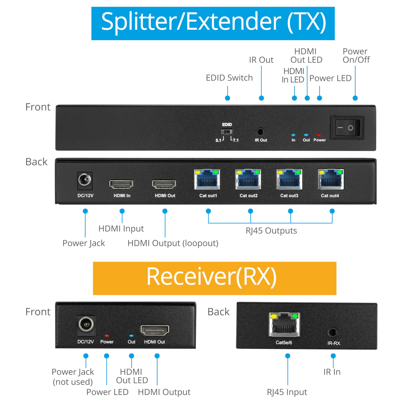 Gofanco 1080P 1X4 Hdmi Extender Splitter Over Cat5E/6/7 Ethernet Cable Up To 165Ft (50M), Hdmi Local Loopout, Poc, Edid, Ir Ex