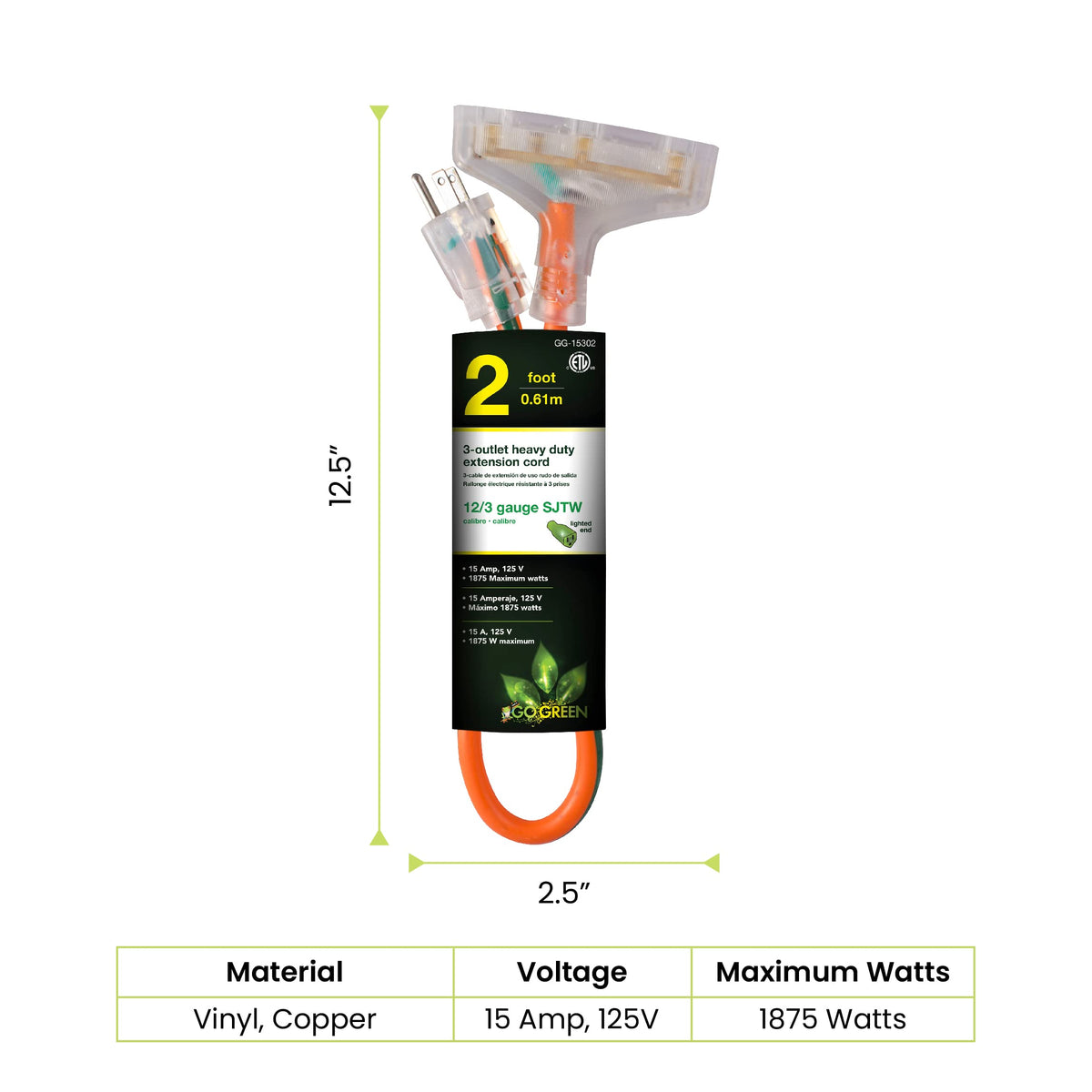Q: What is the length of the GoGreen Power extension cord?A: The GoGreen Power extension cord is two feet long. This compact size makes it ideal for indoor and outdoor use.