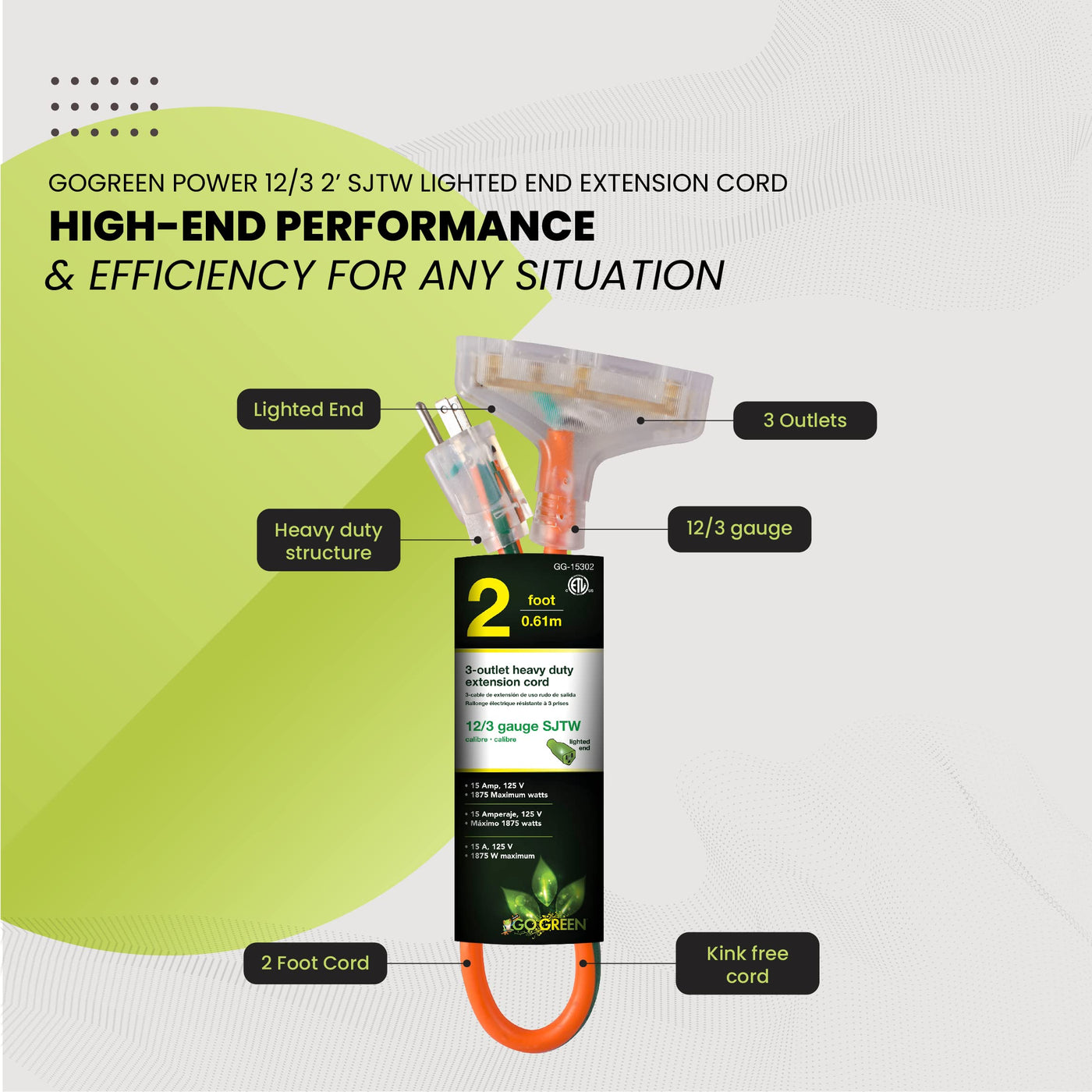 Gogreen Power (Gg 15302) 12/3 2' 3 Outlet Heavy Duty Extension Cord, Lighted End, 2 Feet