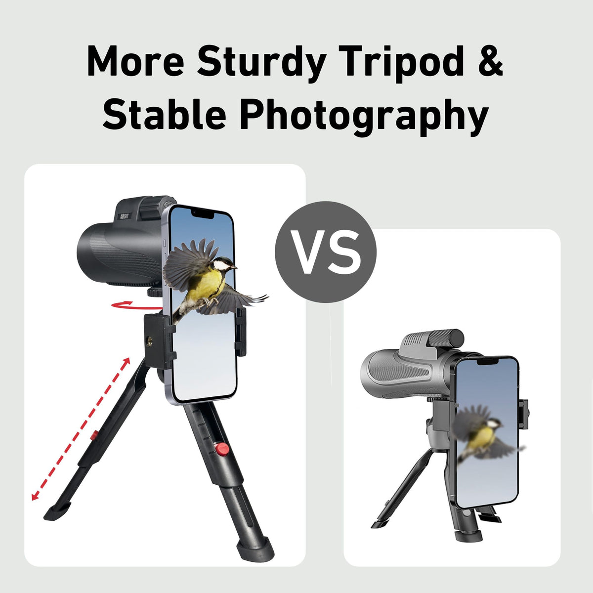 Q: What makes the tripod included with the monocular special?A: The included tripod is upgraded for stability, supports two angles of expansion, is 360° rotatable, and allows for infinite adjustment, ensuring a steady and comfortable viewing experience.