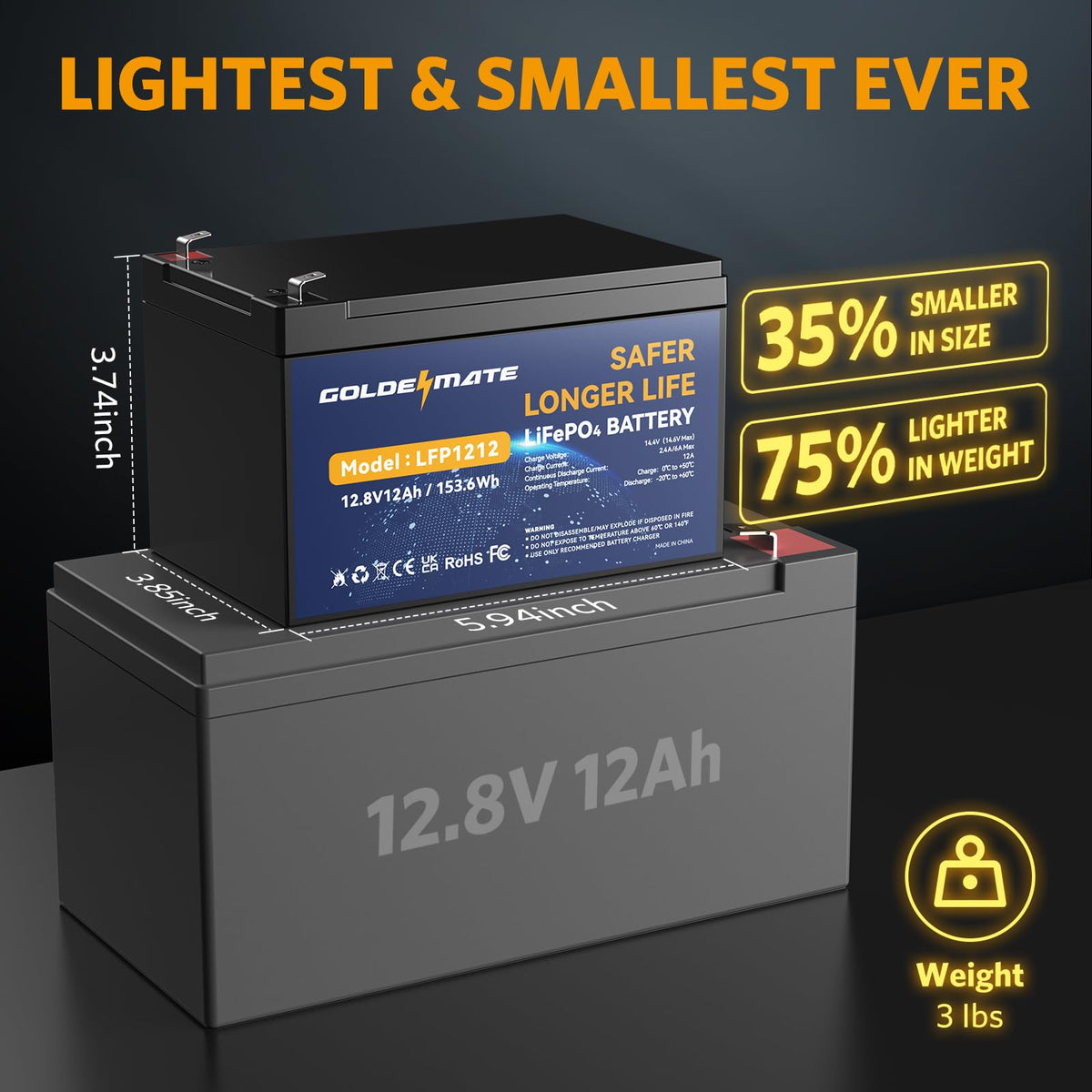 Q: What are the dimensions of the GOLDENMATE 12V 12Ah Lithium Battery?A: The dimensions are five point nine four inches in length, three point eight six inches in width, and three point seven four inches in height.