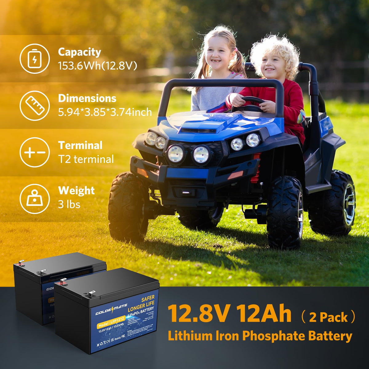 Goldenmate 12V 12Ah Lithium Lifepo4 Deep Cycle Battery 2 Pack, 5000+ Cycle Rechargeable Lithium Iron Phosphate Battery For Solar