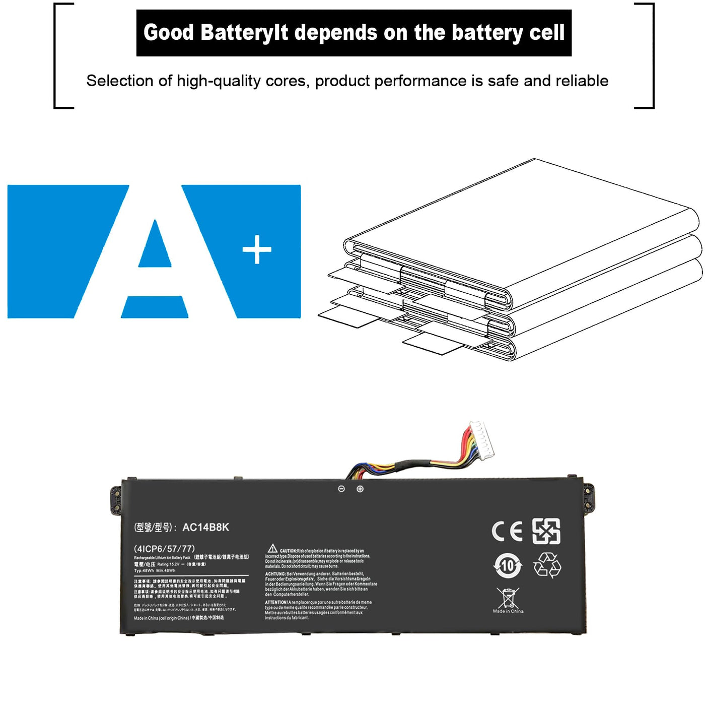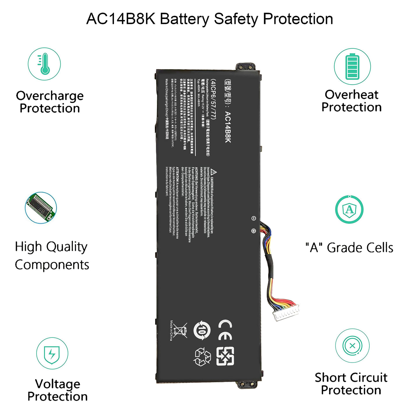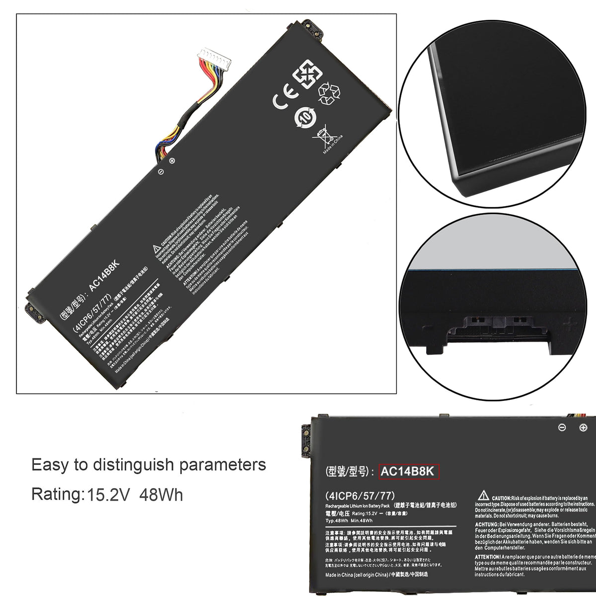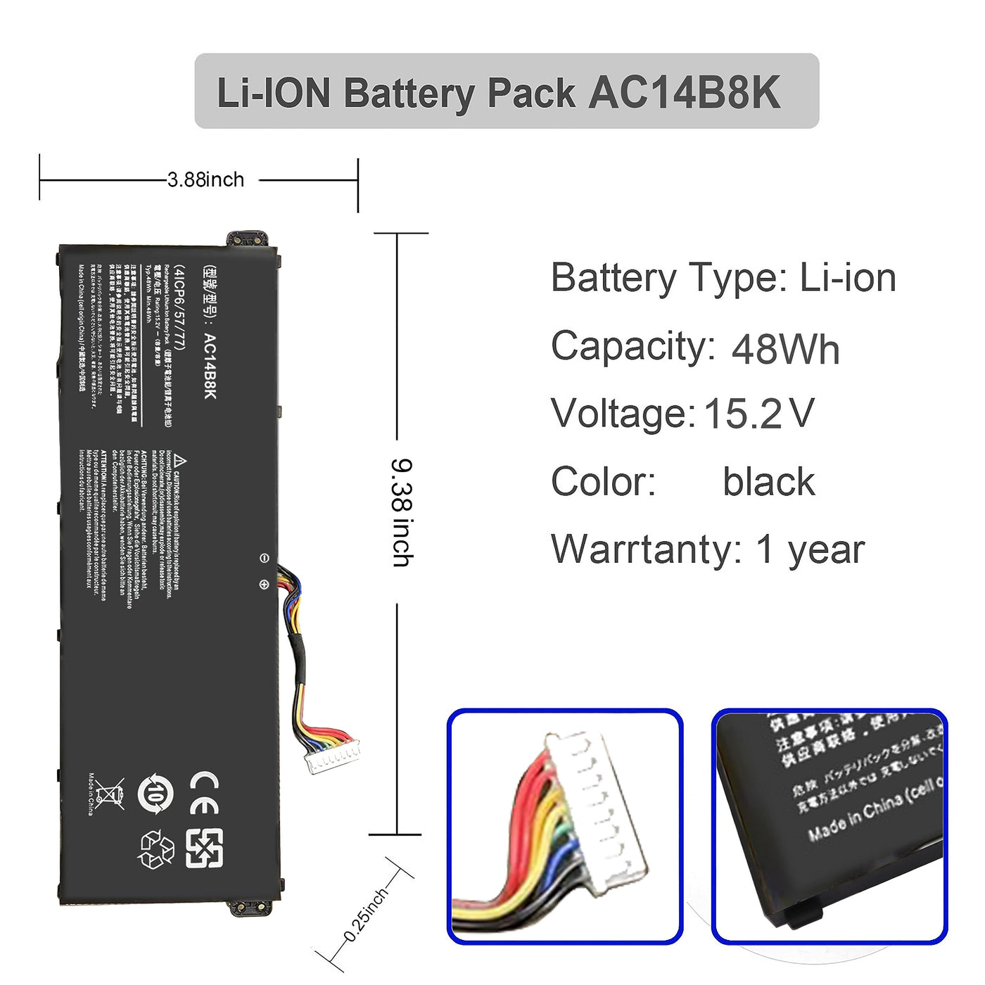 Specifications: Battery Type: Li-Ion Polymer Voltage: 15.2V Capacity:48Wh Cells : 3-Cell Color: Black New From Manufacturer, Grade A Cell Note: The Battery Is Not Compatible With The Ac14B3K And Ac14B18J. Please Check Your Original Battery When You Purchase The Battery. If You Still Not Sure, Please Contact The Seller Compatible With Part Number : Ac14B8K Kt.0040G.004 Kt0030G.004 4Icp5/57/80 3Icp5/57/80 Compatible With Laptop Models: For Acer Chromebook 15 Cb5-571 Cb5-571-C1Dz Cb5-571-C4G4 Cb3-531 Cb3-531-C4A5 For Acer Aspire R3-131T R3-131T-P344 R5-571T R5-571T-59Dc R5-571Tg R5-431T R5-471T R7-371T R7-372T For Acer Aspire All-In-One Z3-700 For Acer Travelmate B115-M, B115-Mp, B116-M, B116-Mp, B117-M, B117-Mp For Acer Travelmate P236-M, P238-M, P276, P276-Mg For Acer Extensa 2508, 2519 Gateway Ne511, Ne512, Ne513 Packard Bell Easynote Tf71-Bm, Tg71-Bm, Tg81-Ba, Tg83-Ba