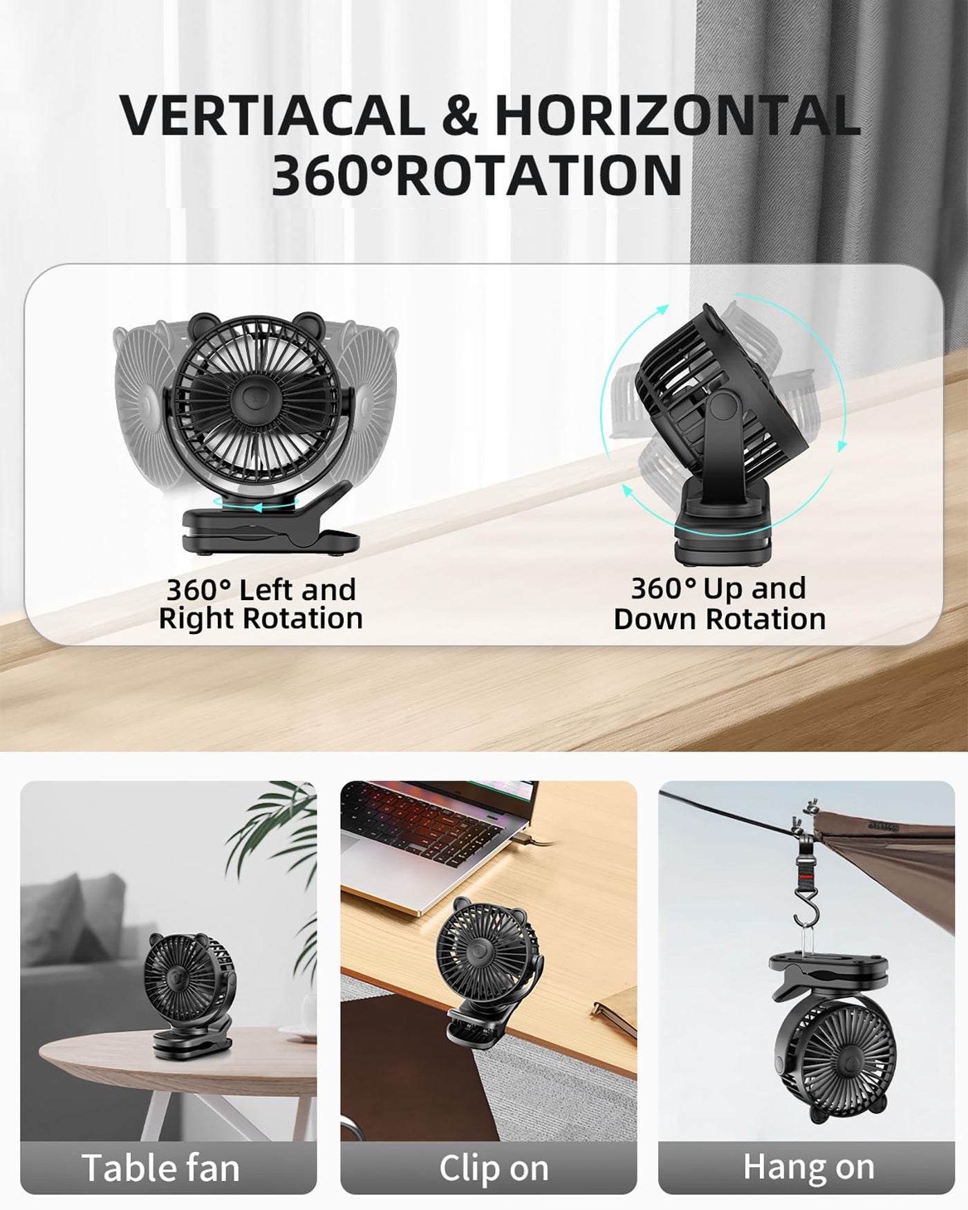 Q: How does the 360-degree rotation feature work on this fan?A: The GOTOTO Clip on Fan offers a full 360-degree rotation, allowing you to adjust the fan both horizontally and vertically to ensure comprehensive airflow wherever you need it.