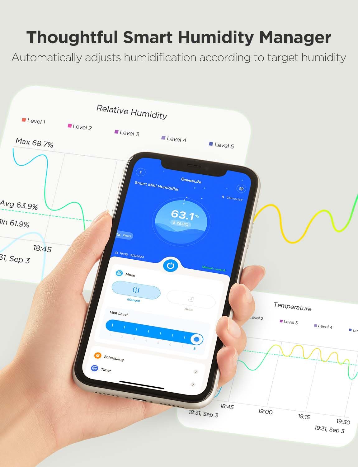 Q: How does the GoveeLife Smart Mini Humidifier maintain optimal humidity levels?A: The GoveeLife Smart Mini Humidifier features an intelligent constant humidity system with a built-in sensor that automatically adjusts the humidification to keep humidity levels comfortable, ensuring a perfect environment for your baby's room.