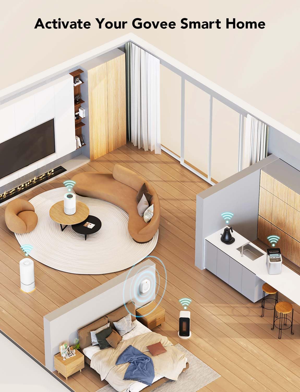 Q: How does the one-touch control feature work?A: The one-touch control feature allows users to automate their environment by executing commands with a single button press. This enables synchronized control of all connected GoveeLife devices, making it easy to manage your smart home.