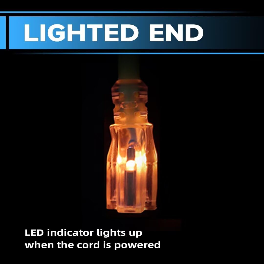 Q: How can I tell if the extension cord is powered?A: The extension cord includes a lighted indicator at the end that illuminates when the cord is powered, allowing you to easily locate it in the dark.