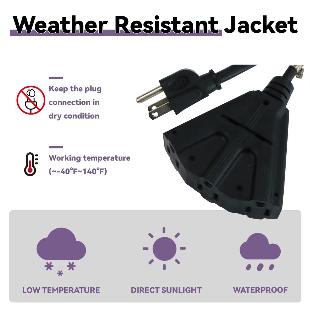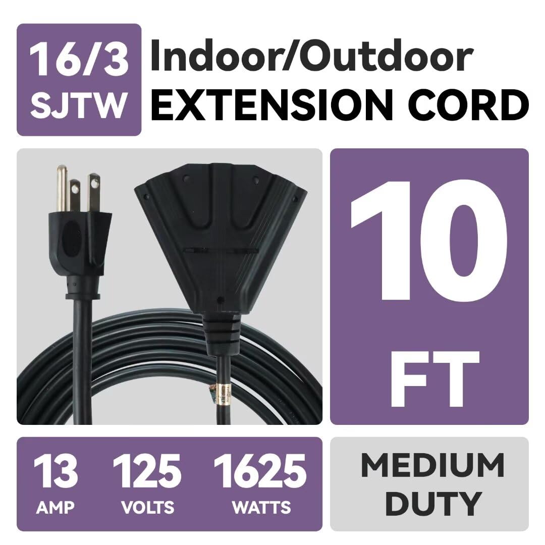 Greatide 10 Ft Outdoor Extension Cord With 3 Electrical Power Outlets 16/3 Sjtw Black Cable With 3 Prong Grounded Plug