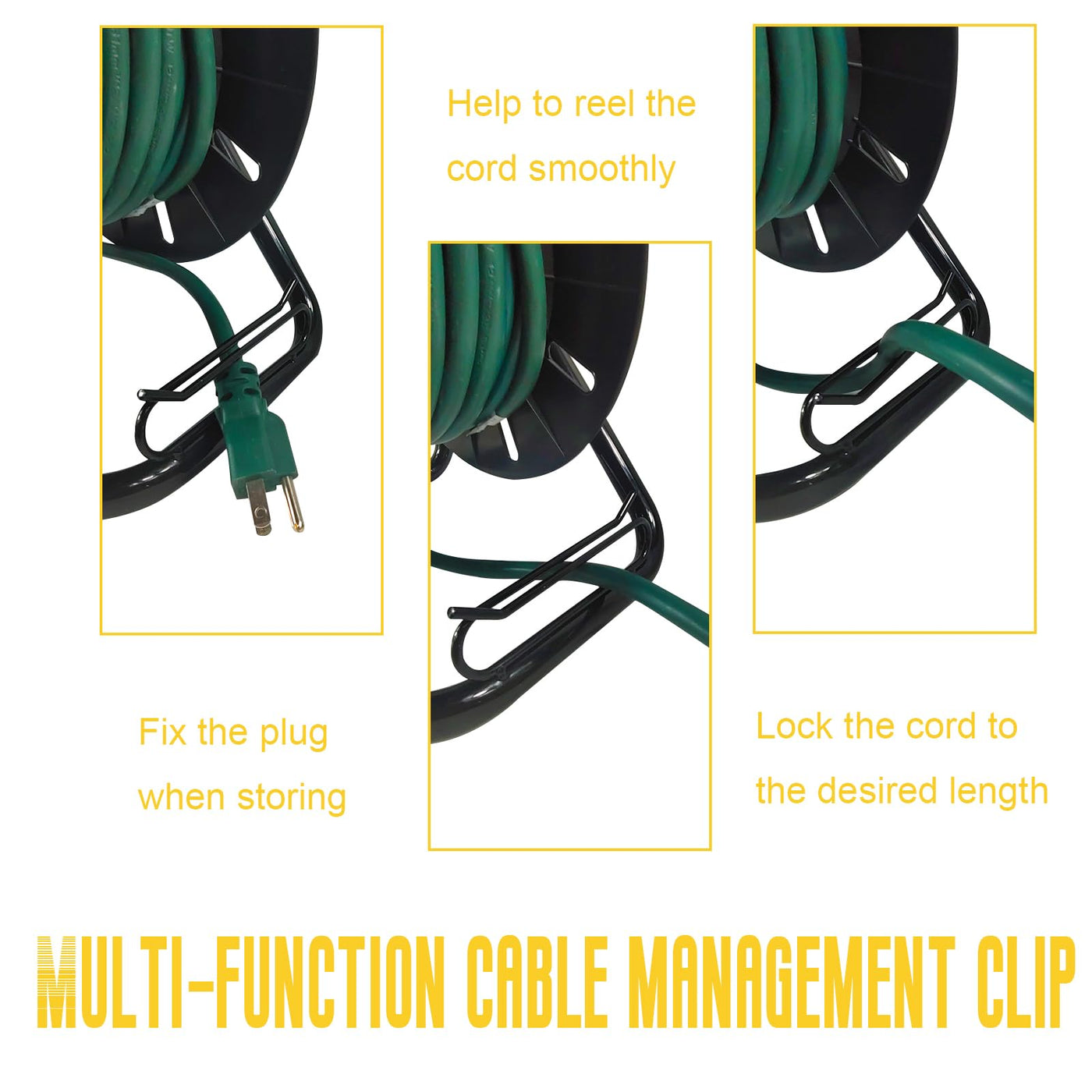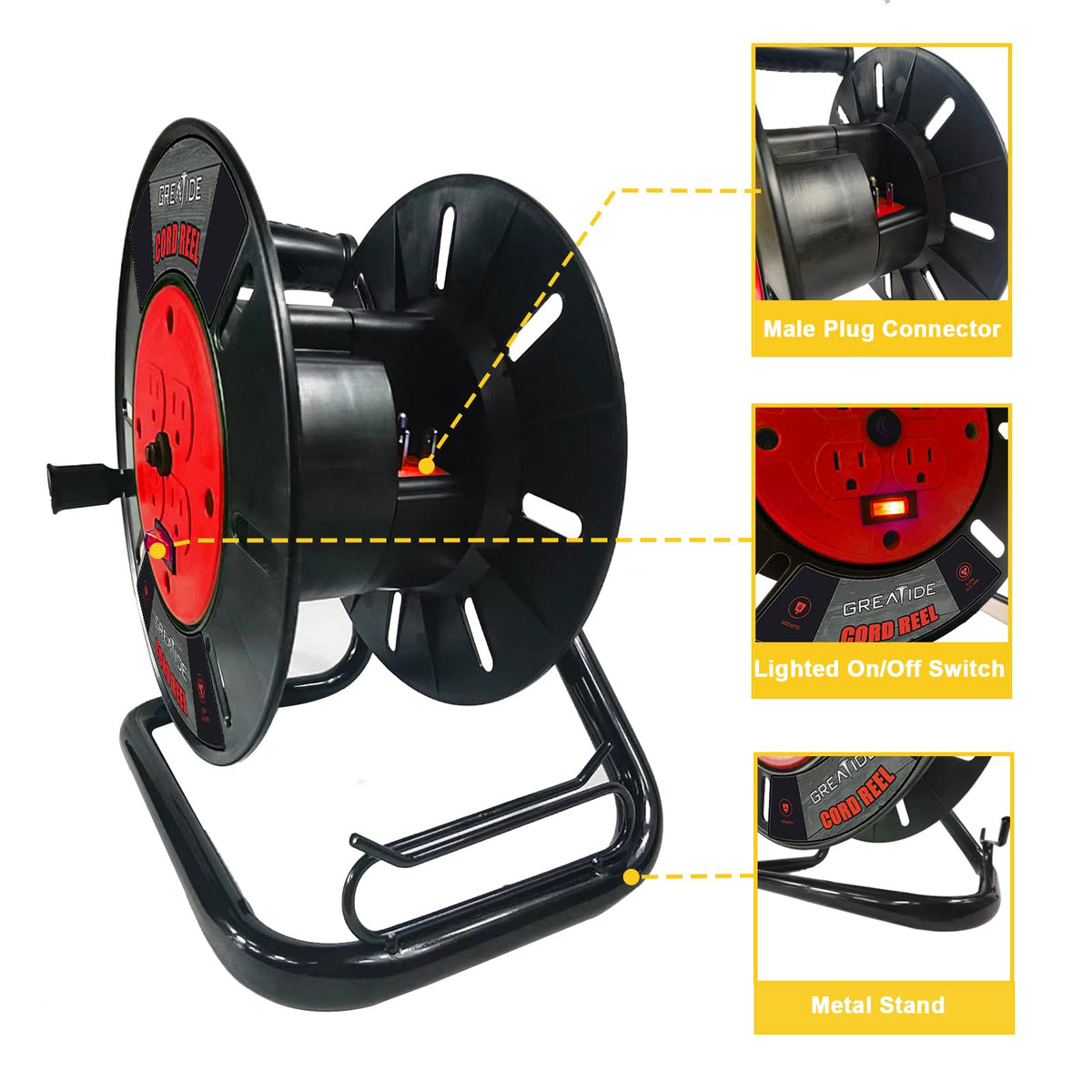 Q: Is the cord reel portable and easy to use?A: Yes, the cord reel is designed for portability with a hand crank for easy winding and unwinding of cords, making it convenient for job sites or storage in the garage.
