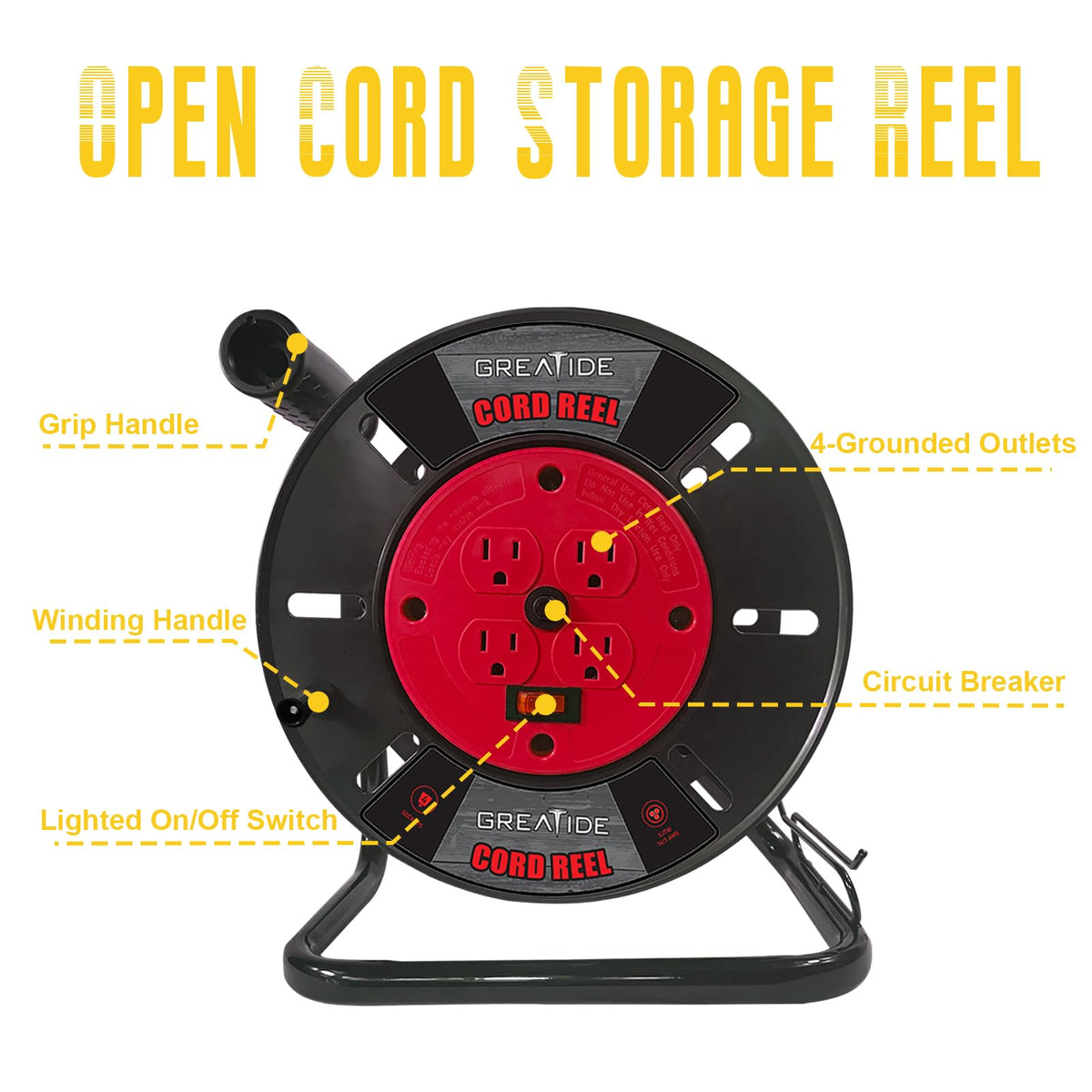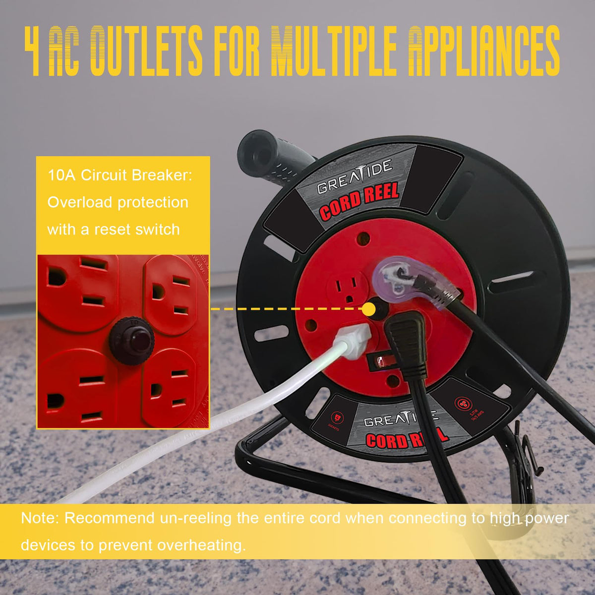 Greatide Heavy Duty Extension Cord Storage Reel With 4 Grounded Outlets, 10A Circuit Breaker, Retractable Hand Wind, Portable Em