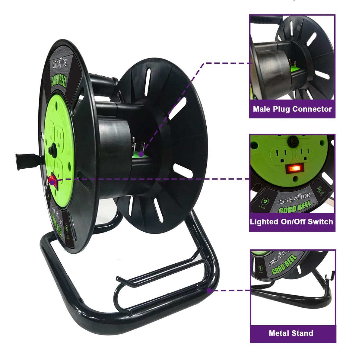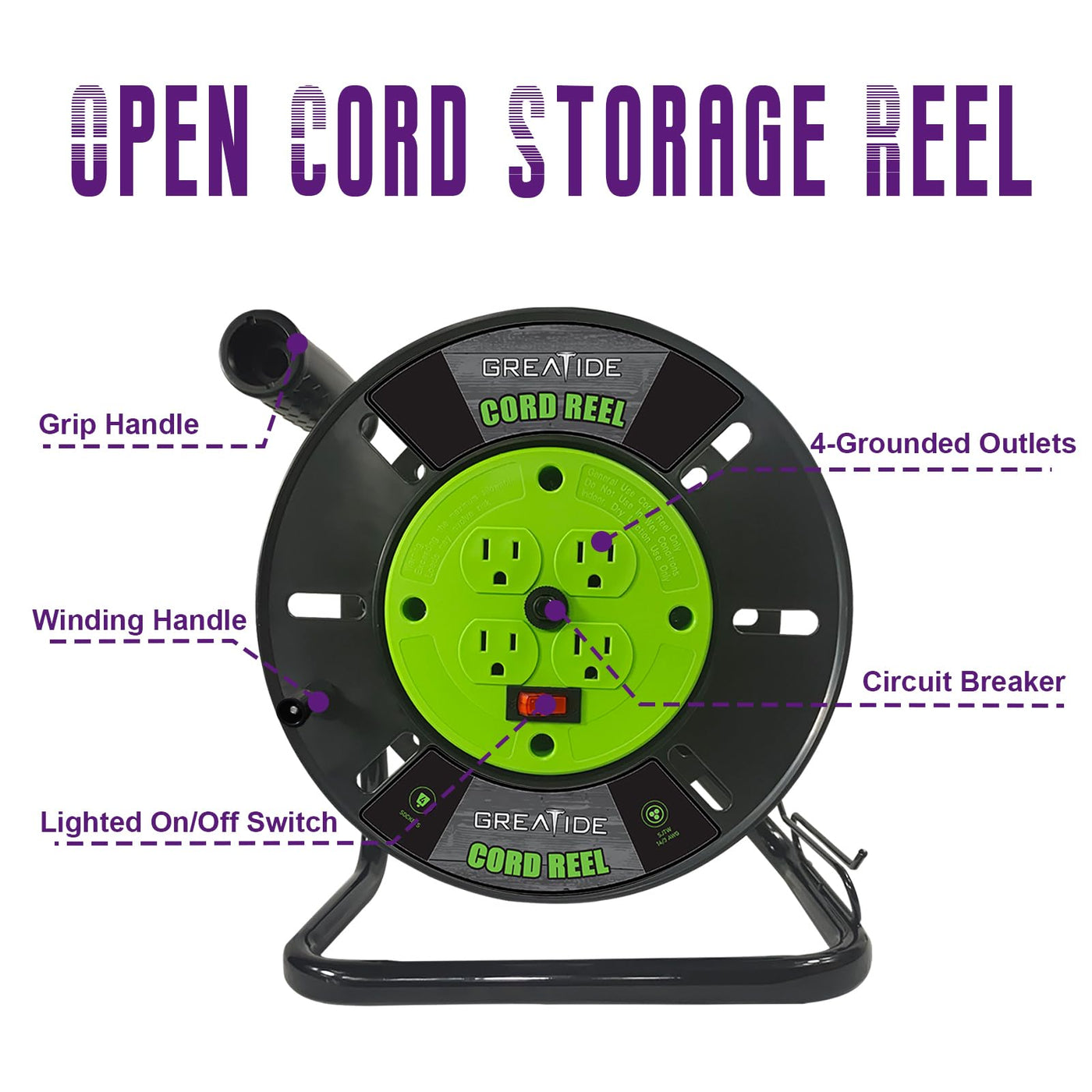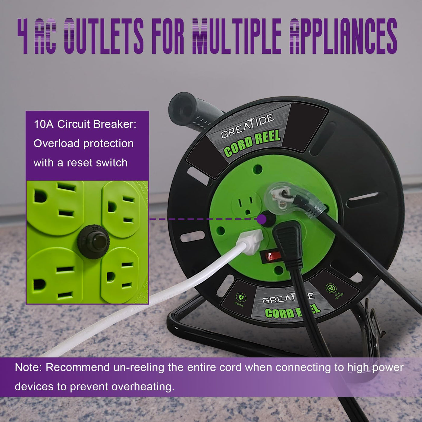 Greatide Heavy Duty Extension Cord Storage Reel With 4Grounded Outlets, 10A Circuit Breaker, Retractable Hand Wind, Portable Emp