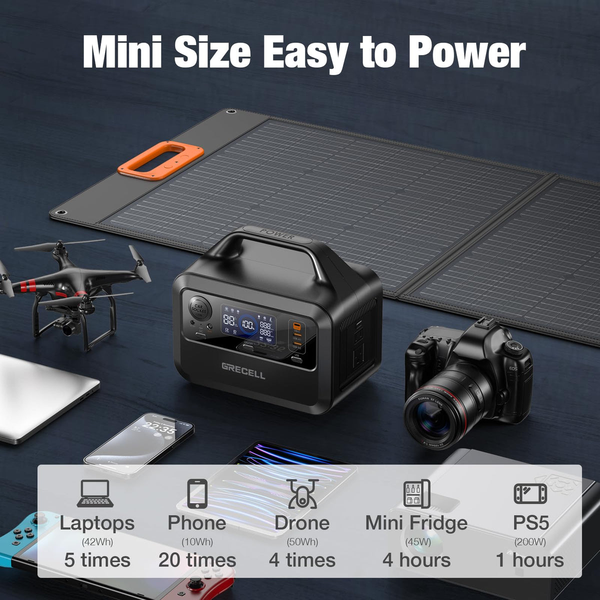 Q: What devices can I charge with the GRECELL Portable Power Station?A: The GRECELL Portable Power Station can charge a variety of devices including laptops, tablets, smartphones, cameras, drones, lights, fans, mini-refrigerators, and CPAP medical devices, as long as their rated power is less than 300W.