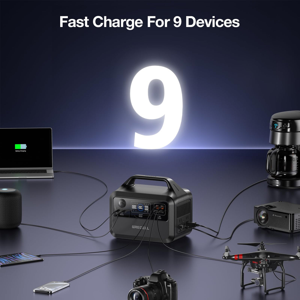 Q: What devices can I power with the GRECELL Portable Power Station 600W?A: The GRECELL Portable Power Station 600W can power a variety of devices including drones, laptops like MacBooks, cameras, and other essential electronics. It features 2 AC outlets, 2 DC outlets, and 4 USB outlets, allowing you to charge up to 8 devices simultaneously.