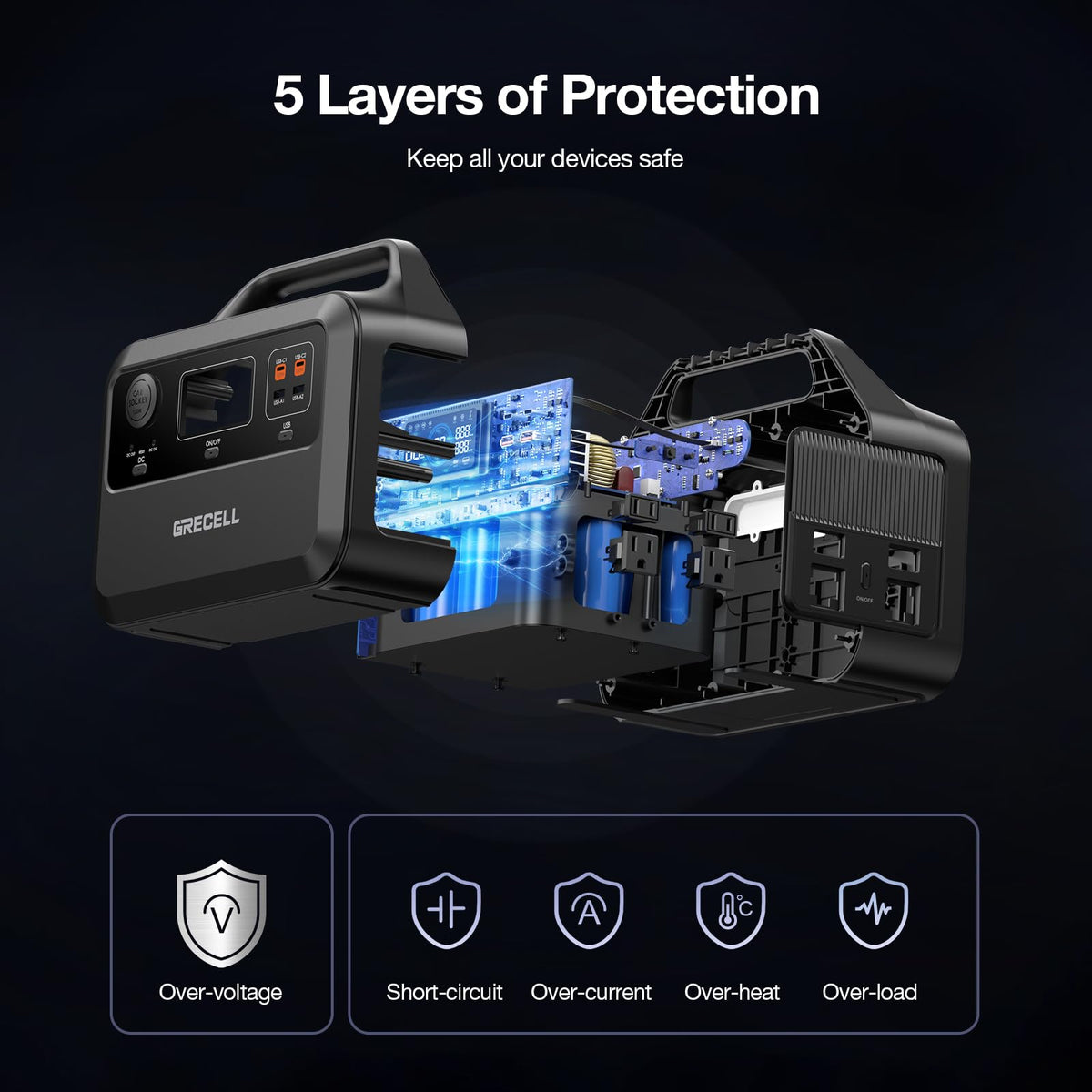 Q: Is the GRECELL Portable Power Station safe to use?A: Yes, the GRECELL Portable Power Station is equipped with advanced safety features. It uses lithium iron phosphate (LiFePO4) batteries and an eight-layer safety BMS to protect against over-charge, over-discharge, over-voltage, over-current, and short-circuits, ensuring safe and reliable operation.