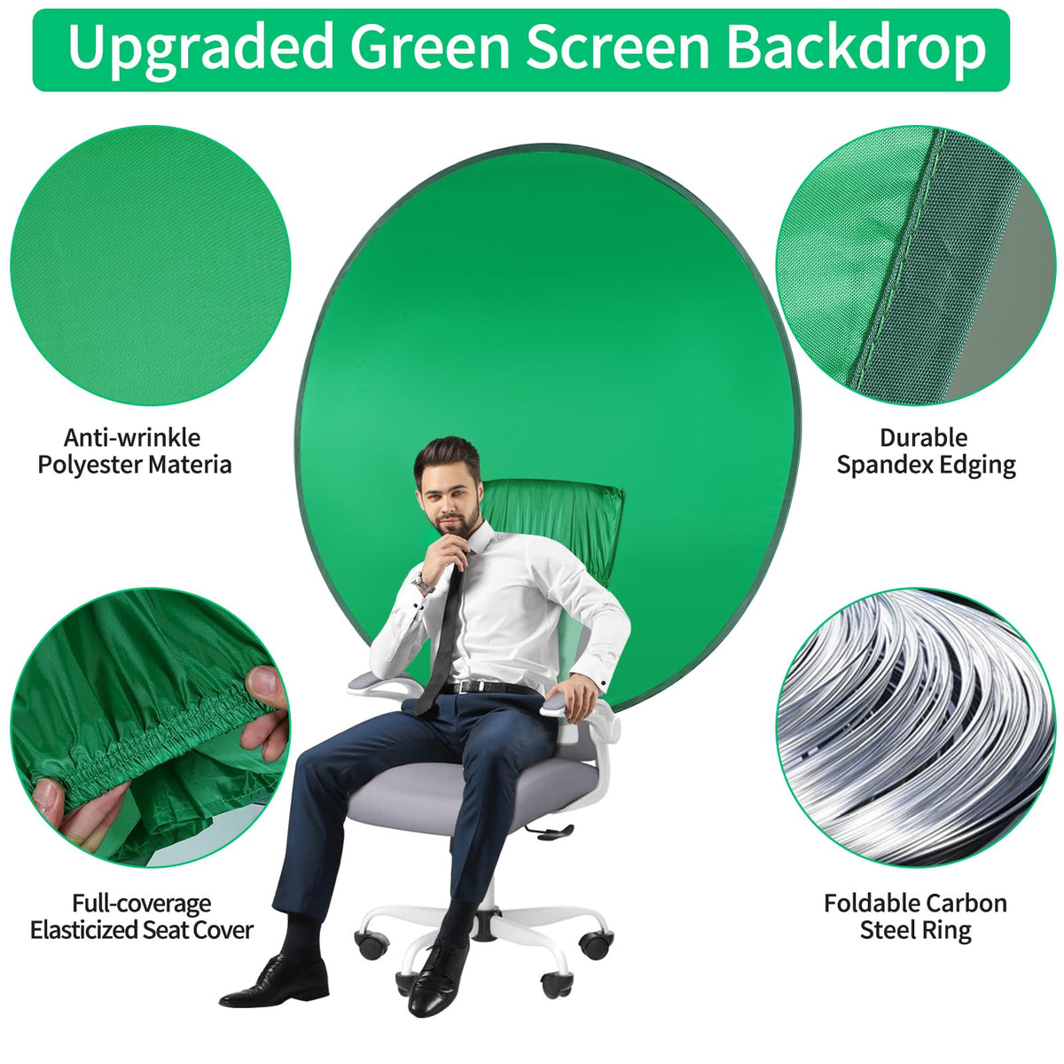 Q: Is the green screen compatible with all types of chairs?A: The green screen backdrop comes with a permanent self-adhesive tape with Velcro, making it suitable for most types of chairs, including gaming and office chairs.