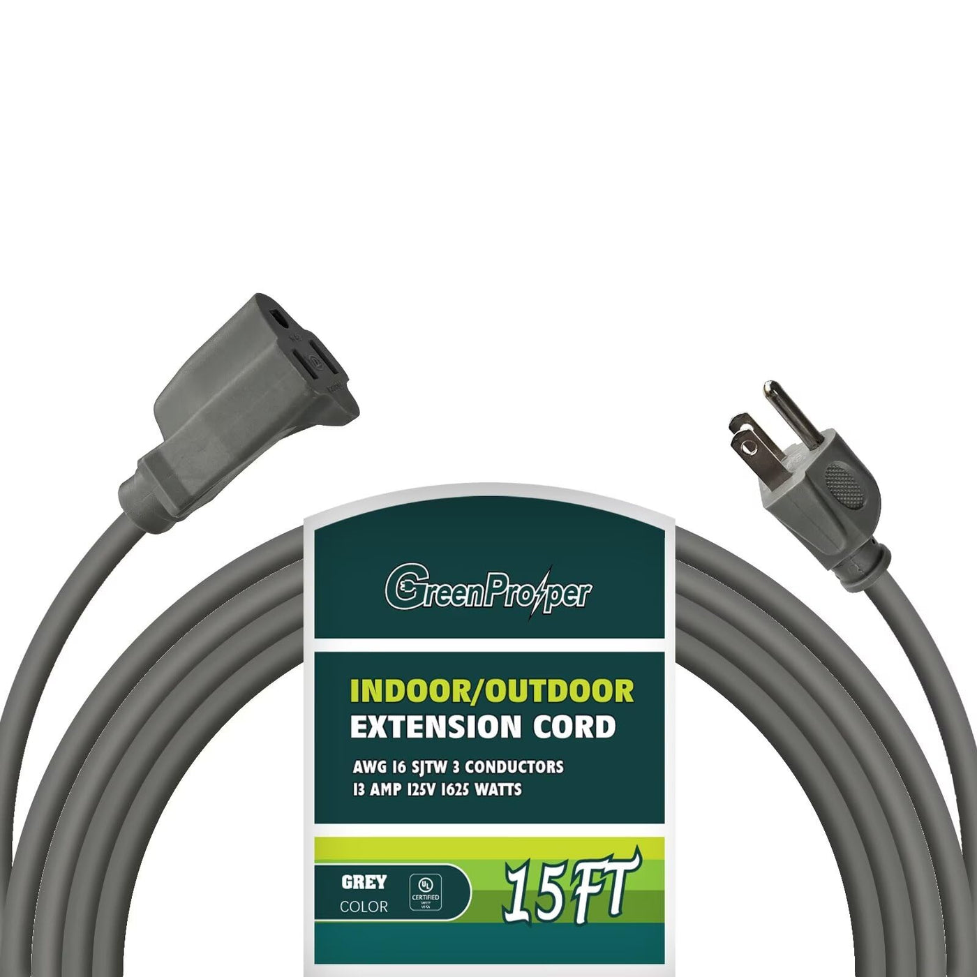 Greenprosper 15 Ft Indoor Outdoor Grey Extension Cord, 16 Gauge Waterproof Electrical Power Cable, 16/3 Sjtw 3 Prong Grounded Pl