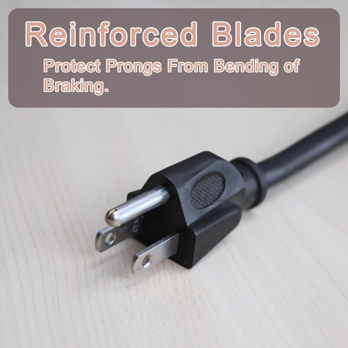 Q: What safety features does this extension cord have?A: The GreenProsper extension cord comes equipped with reinforced, nickel-coated blades to prevent bending or breaking. It is UL-listed, ensuring compliance with strict safety standards, and features double-layer PVC insulation that protects against abrasion, moisture, and wear.