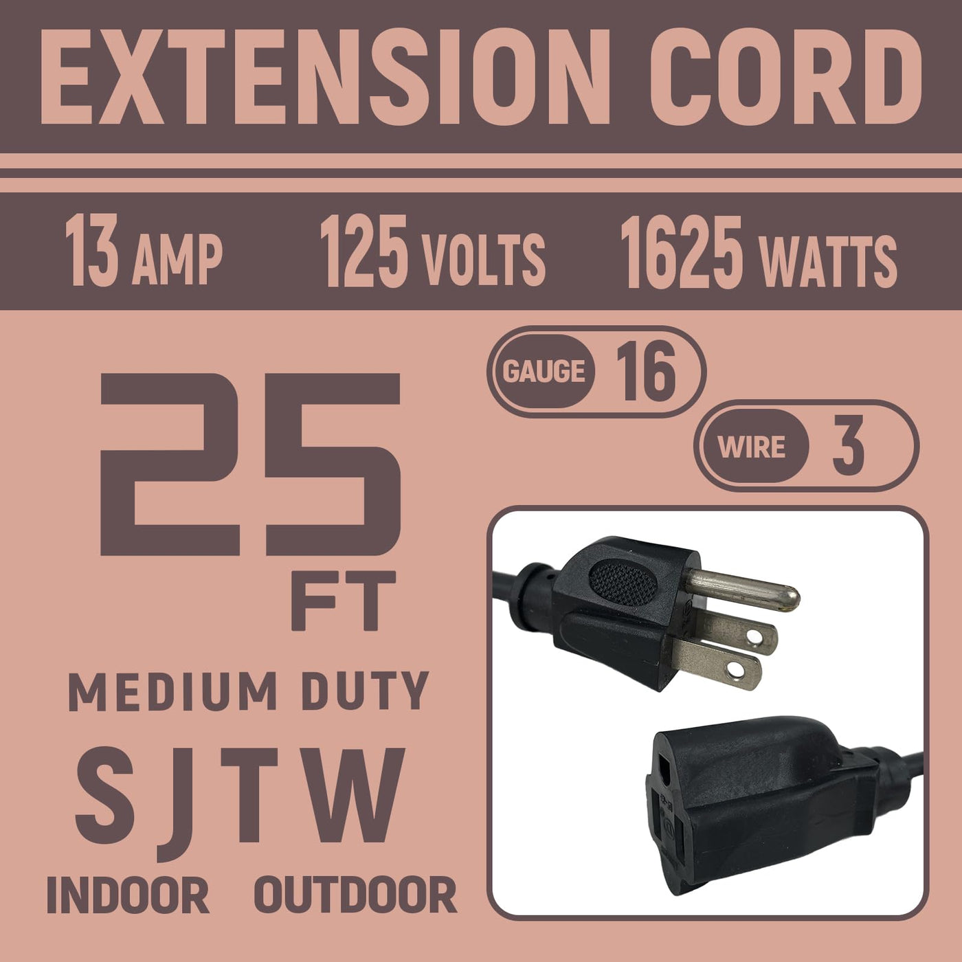 Greenprosper 25 Ft Indoor Outdoor Black Extension Cord, 16 Gauge Waterproof Electrical Power Cable, 16/3 Sjtw 3 Prong Grounded P