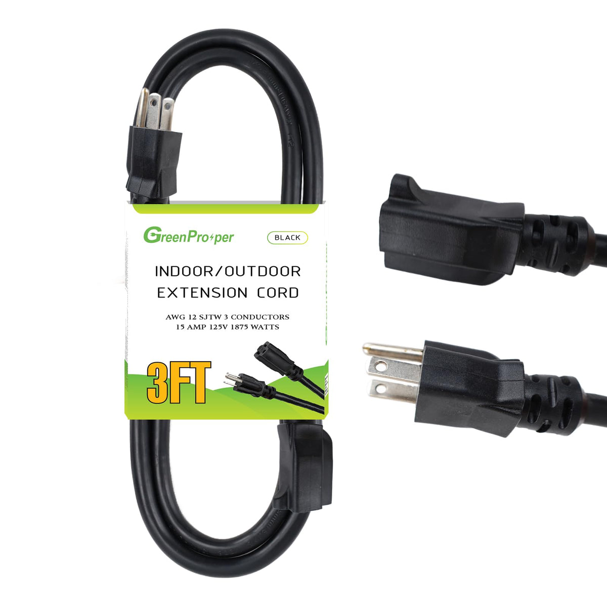 Greenprosper 3 Ft Outdoor Indoor 12 Gauge Extension Cord, 12/3 15 Amp Sjtw Heavy Duty Black Extension Cable With 3 Prong Grounde