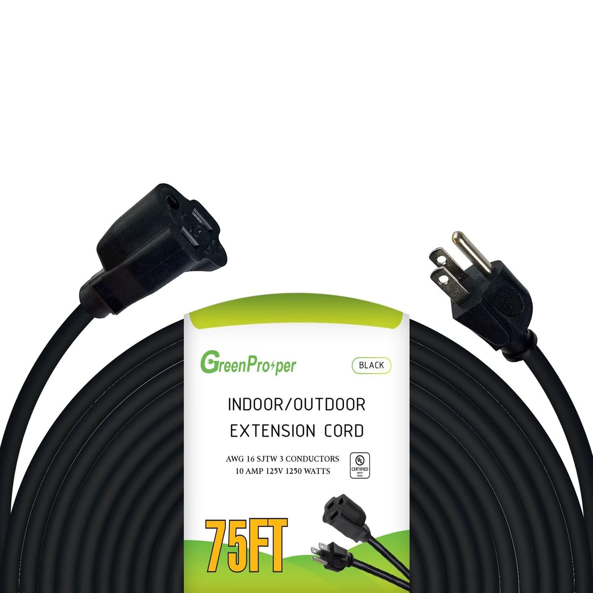 Engineered With 16 Gauge Heavy-Duty Wiring, This 75 Foot Black Extension Cord Delivers 13A, 125V, And 1625W Of Reliable Power, Perfect For High-Performance Tools And Appliances. Whether You'Re Operating A Lawn Mower, Pressure Washer, Or Power Tools, This Cord Ensures Consistent Energy Flow With Minimal Voltage Drop, Keeping Your Equipment Running Smoothly. | Featuring A Weather-Resistant Sjtw Jacket, This Extension Cord Is Designed To Withstand Rain, Snow, And Uv Exposure. Its Flexible, Cold-Resistant Construction Remains Tangle-Free Even In Freezing Temperatures As Low As -40