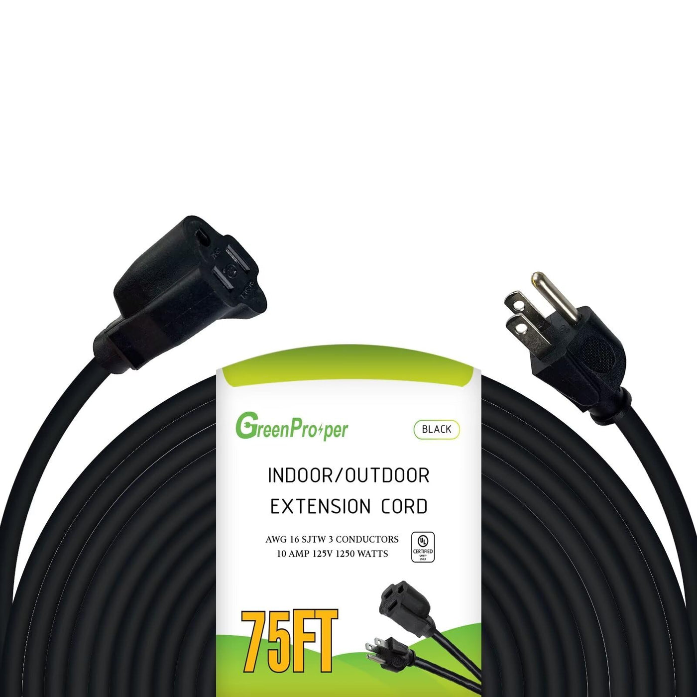Greenprosper 75 Ft Indoor Outdoor Black Extension Cord, 16 Gauge Waterproof Electrical Power Cable, 16/3 Sjtw 3 Prong Grounded P
