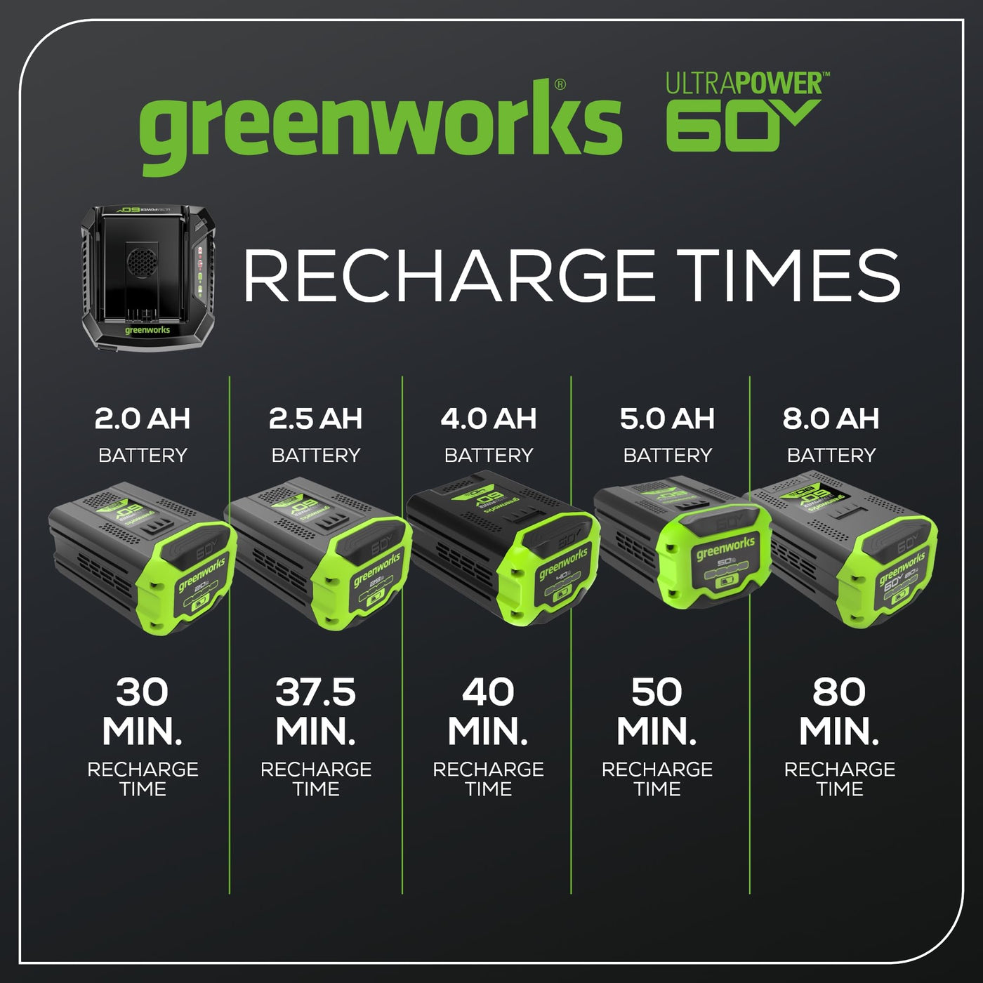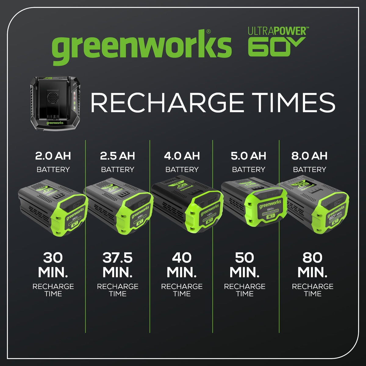 Q: What types of batteries are compatible with the Greenworks Pro 60V Ultra Power 6A Rapid Charger?A: The Greenworks Pro 60V Ultra Power 6A Rapid Charger is compatible with all Greenworks Pro 60V batteries, allowing you to charge multiple battery types within the Greenworks 60V ecosystem.