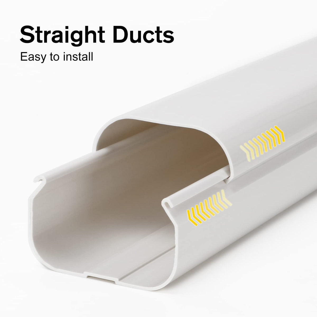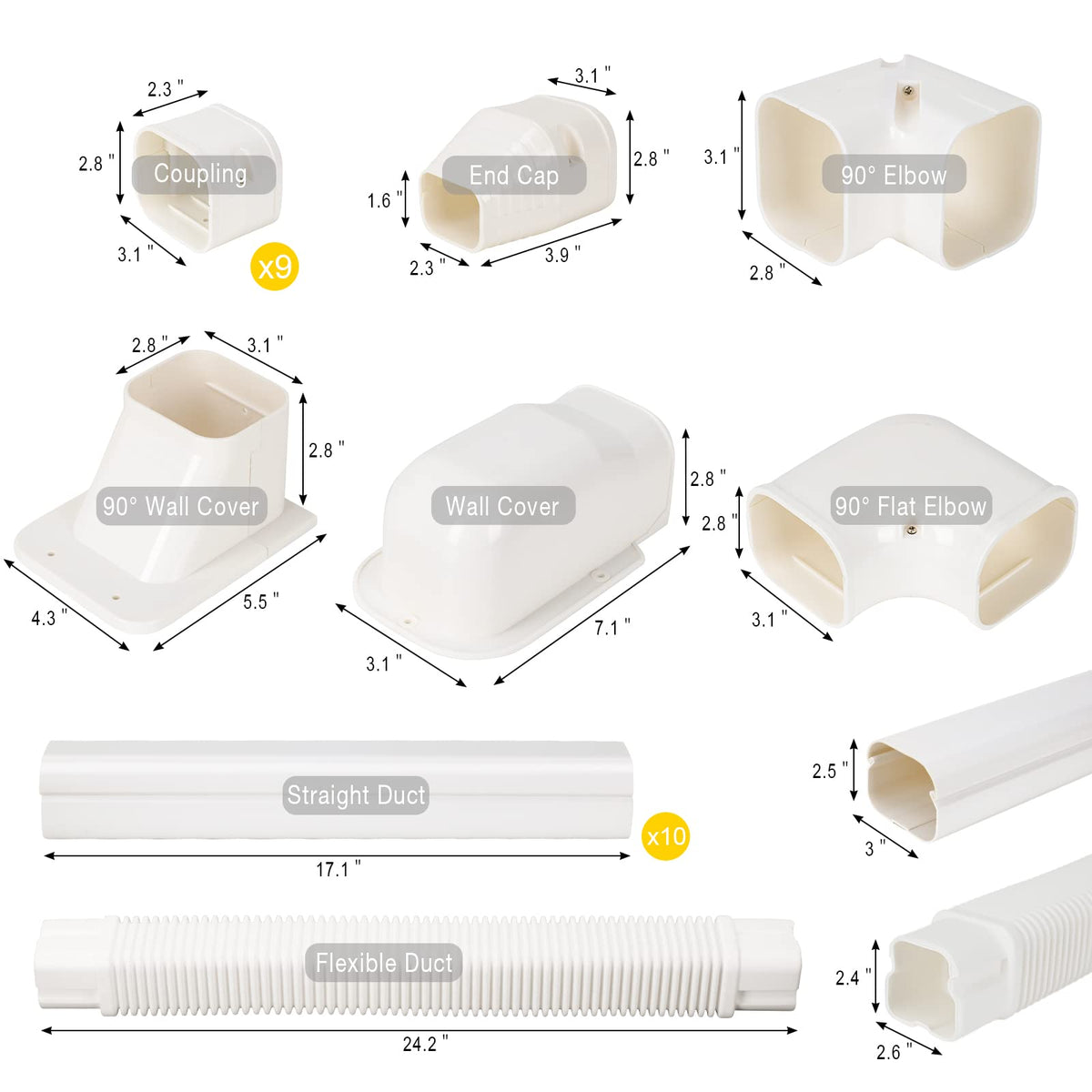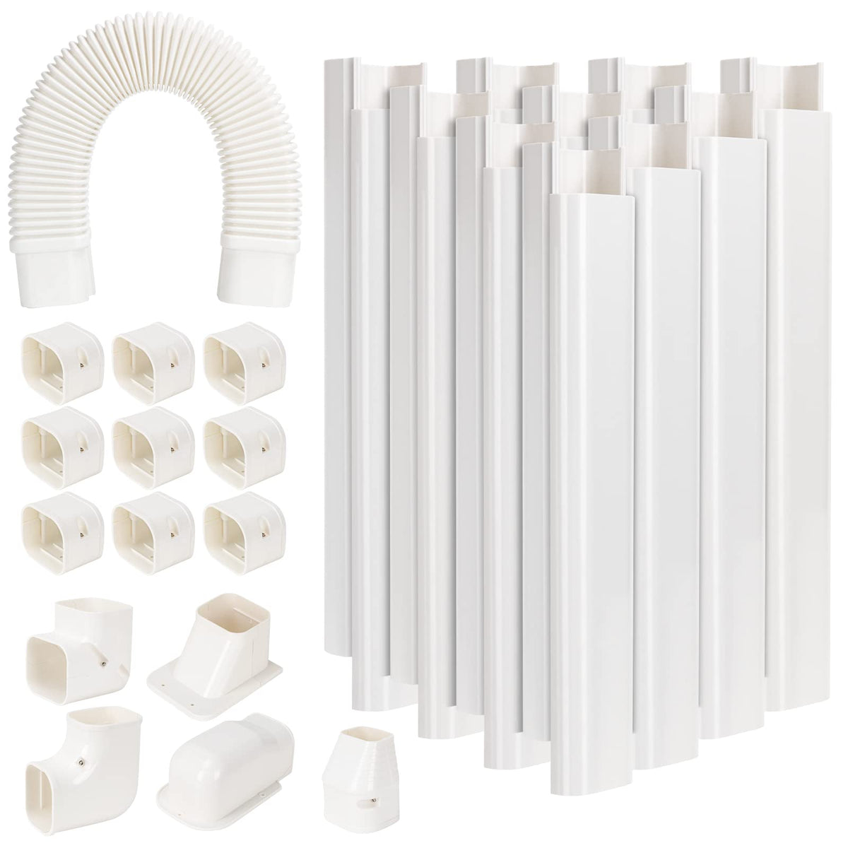 Q: What is included in the GUEQUITLEX 3" W 16.1 Ft Line Set Cover Kit?A: The kit includes 10 pieces of 1.41 ft straight ducts, 1 piece of 2 ft flexible duct, 1 wall cover, 1 90° wall cover, 1 90° flat elbow, 1 end cap, 1 90° elbow, and 9 couplings, providing everything needed for installation.