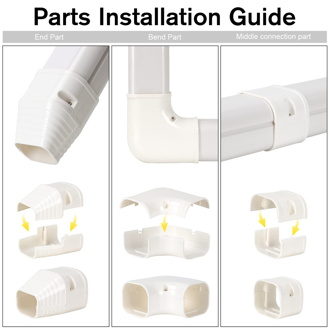 3-Step Installation Of Mini Split Ac Line Cover Kit1. Drill The Frame To The Outside Wall Where The Line Set Comes Out From The Indoor Unit And Connects To The Outdoor Unit. 2. Screw The Frame To The Outside Wall, And Then Use The Provided Zip Ties To Secure The Line Set To The Frame.3. Secure The Top Into Place, And Then Snap On All The Other Pieces Simply. You Can Also Use Elbow Piece To Install At An Angle.