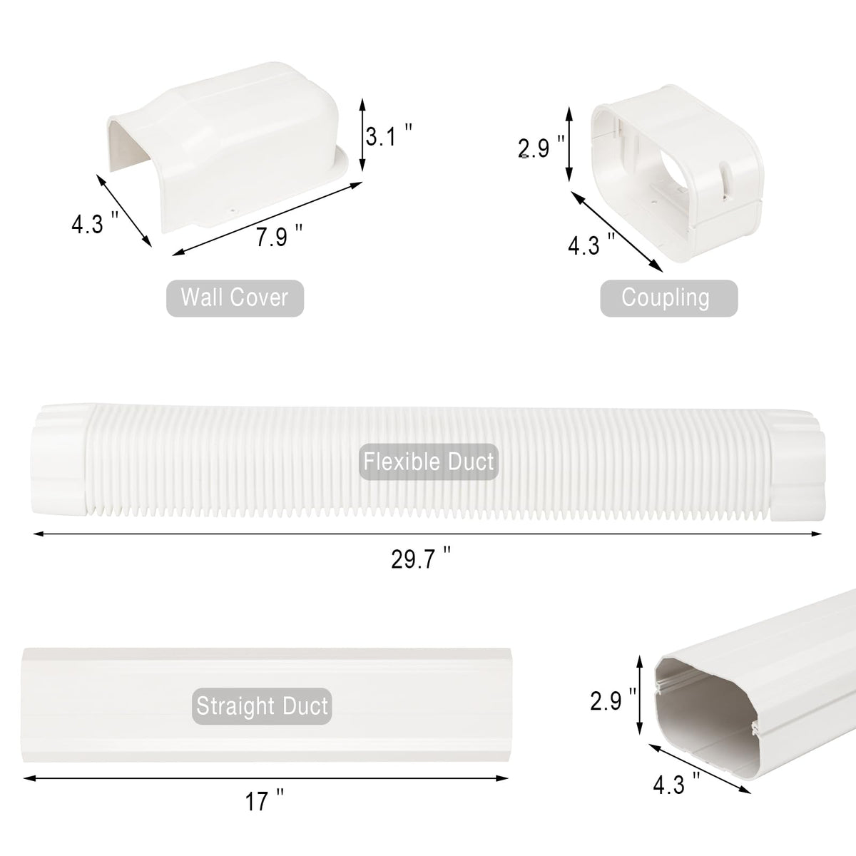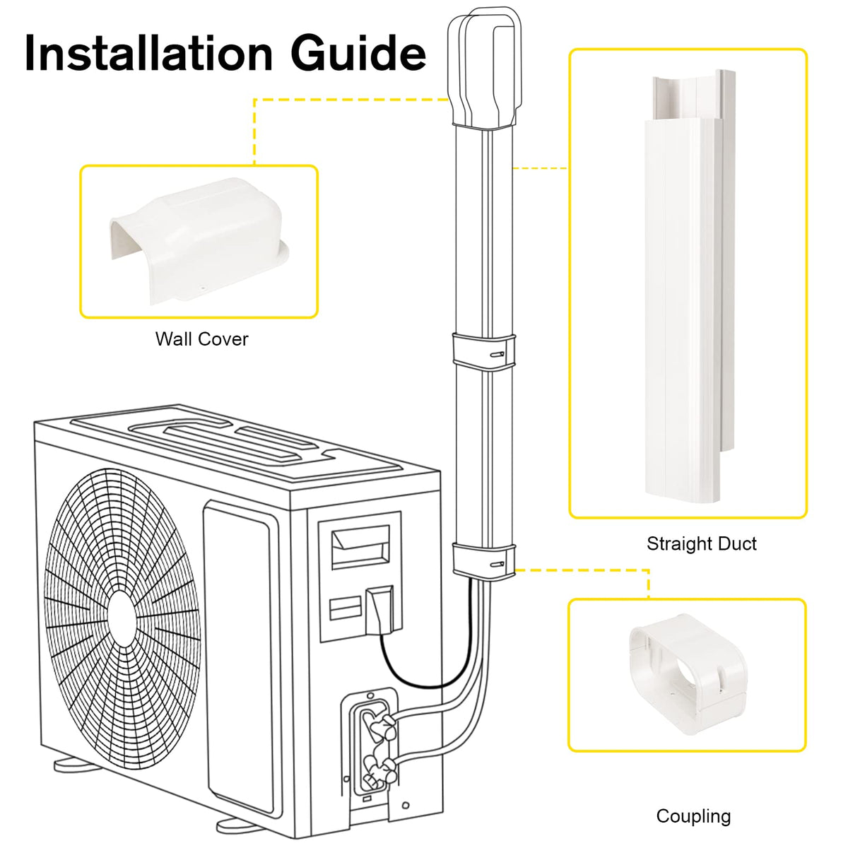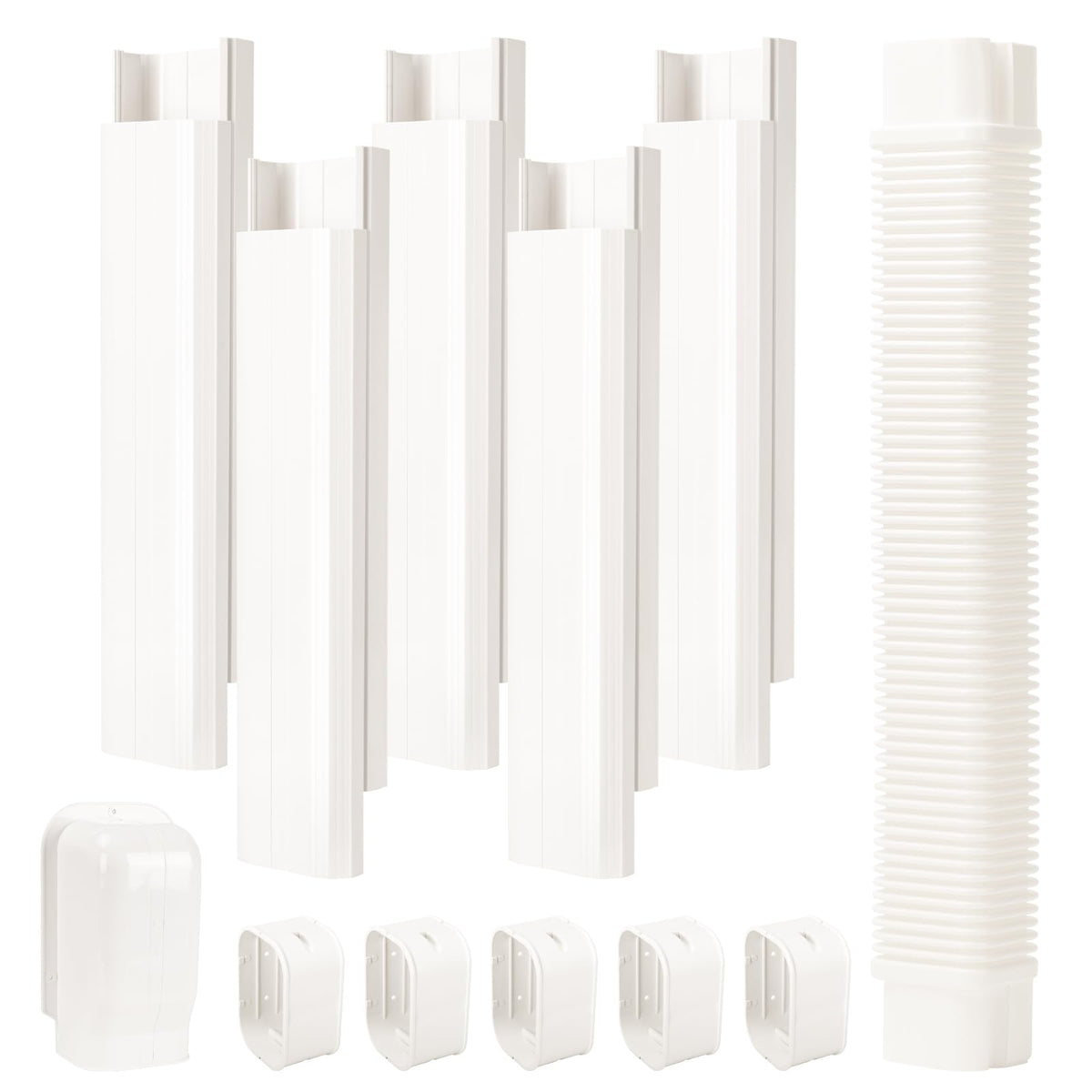 Q: What is included in the GUEQUITLEX AC line cover kit package?A: The package includes a complete set of AC line cover accessories: 5 straight ducts measuring 17 inches each, 1 flexible duct measuring 30 inches, 1 wall cover, and 5 couplings.