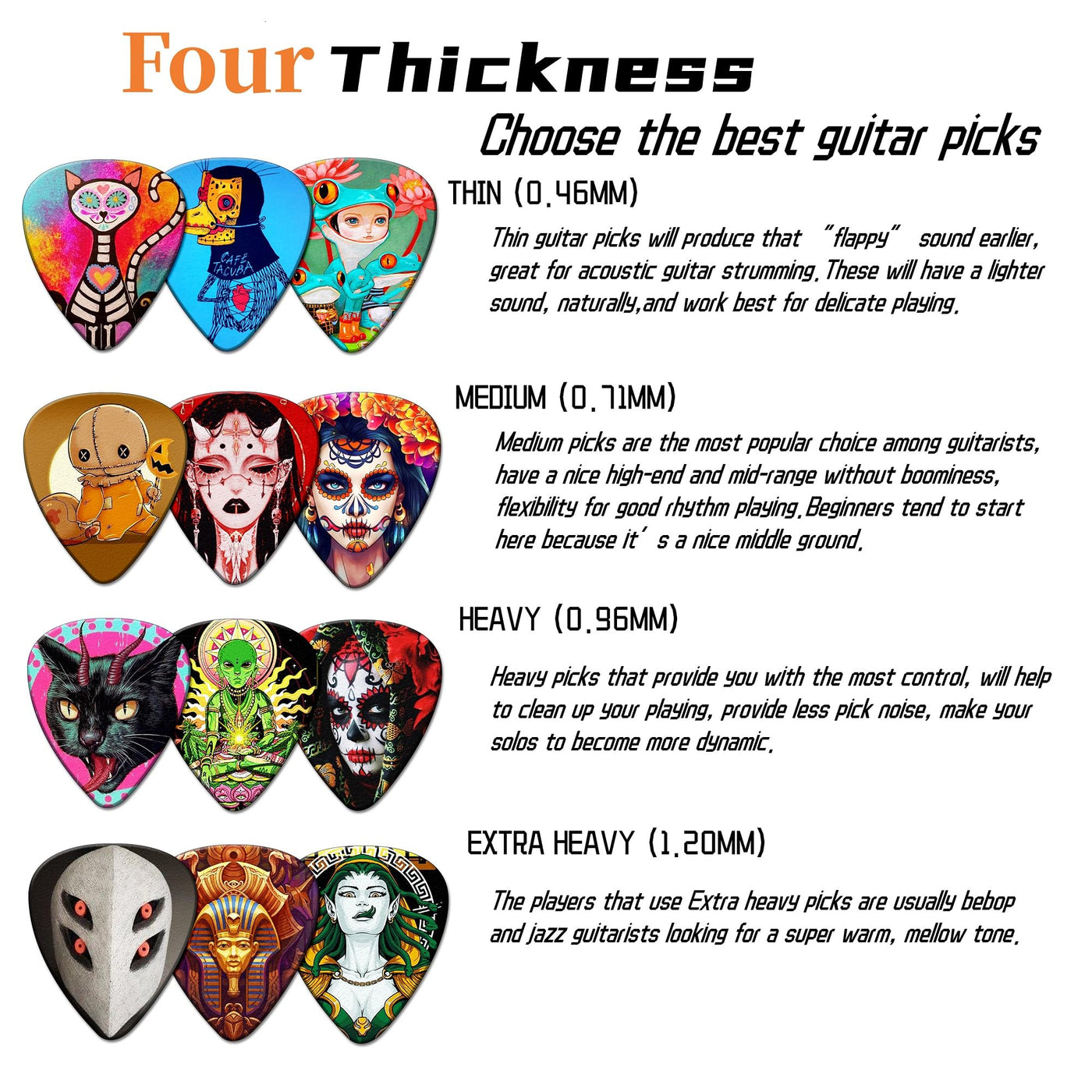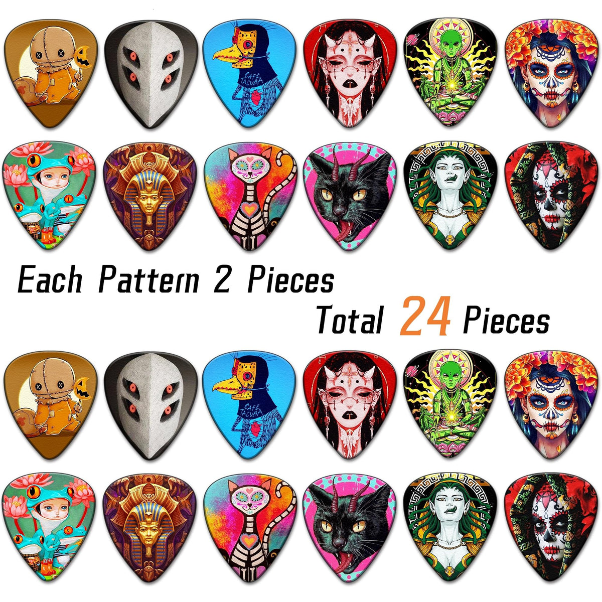 Guitar Picks 24 Pack Unique Artistic Celluloid Guitar Picks & Bass Picks Guitar Picks Made From Celluloid, The Best Material For Guitar Pics, Which Providing Good Elasticity, Firmness, And A Clear And Pleasant Tone.Unique Guitar Picks Smooth Edge Makes Playing Comfortable Without Hurting Fingers Or Hands. Exquisite Printing Makes The Pattern Hard To Shedding. Unique Design Embodies Your Unique Taste, Makes You The Most Unique Guitarist. Funny Guitar Picks Featuring 24 Unique Artistic Designs: - Cool Art And Music Combination - Upgrade Your Musical Performance And Appearance As An Artist! - Strum Your Guitar With Style! - Source Of Endless Inspirationpersonalized Guitar Picks With Tin Box---Cool Guitar Accessories Gifts For Guitarists - Wonderful Gifts For Musicians And Art Lovers - For Beginners And Professional Guitarists - Ideal Gift For Acoustic, Electric And Bass Guitar Players - Cool Gift For Birthdays, Christmas And Special Occasions Wonderful Guitar Accessories Set: - 24 X Guitar Picks (Each Design Is 2 Packs) - 1 X Tin Box