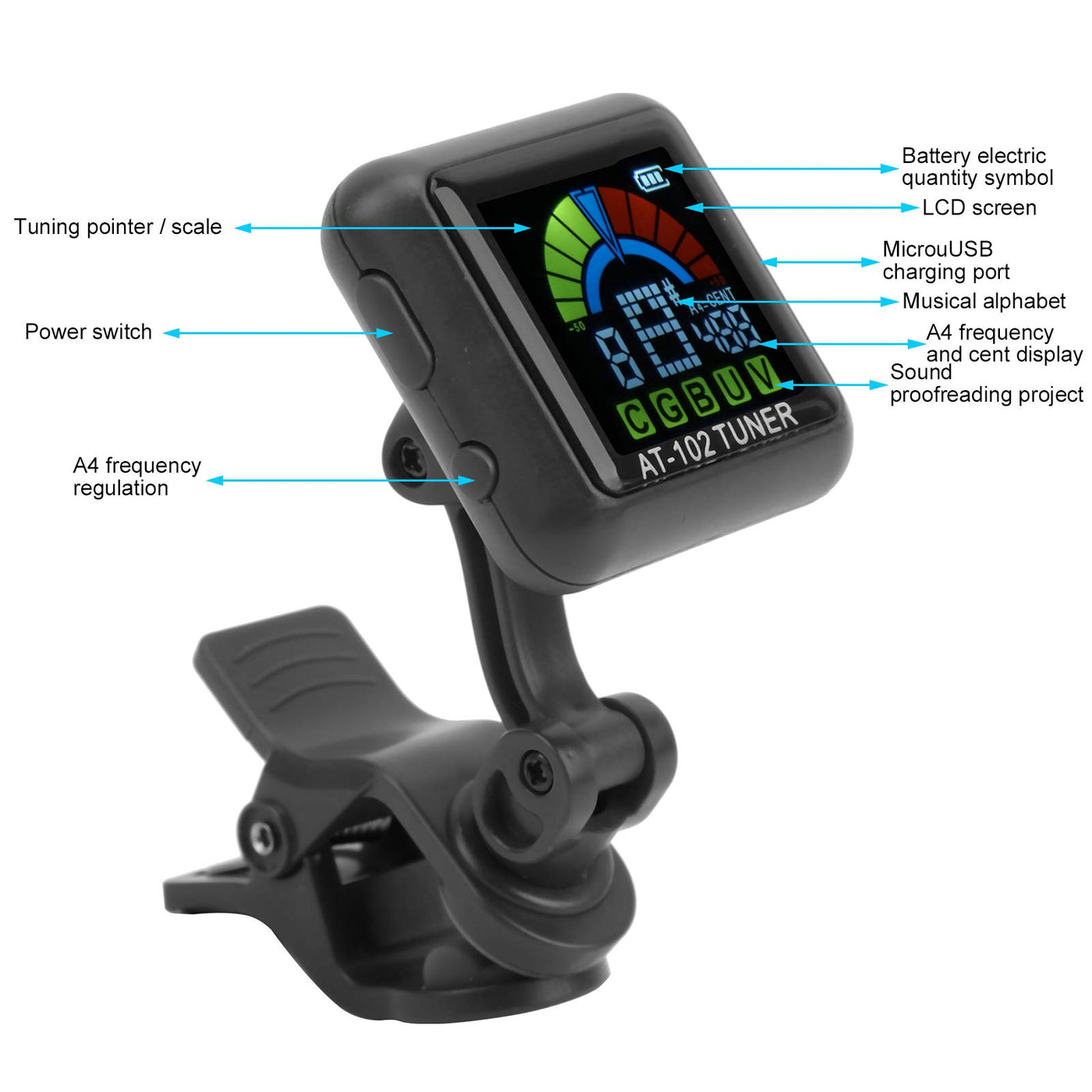 Feature: 1. This Compact Clip On Tuner Is Suitable For Halftone / Guitar / Bass / Ukulele / Violin. 2. Come With Built-In Battery, You Can Also Easily Connect And Charge With The Attached Usb Power Cord. 3. High Definition Color Screen Is Adopted To Make The Operation Easier And Clearer. 4. The Clip-On Tuner Is Very Flexible To Change Angles To Better Read The Information. 5. The Product Can Be Placed In Front Of Or Behind The Instrument, Both Way Will Obtain Excellent Effect. Specification: Item Type: Guitar Clip-On Tuner Model: At-102 Material: Abs + Pmma Suitable Or Musical Instruments: 12 Equal Temperament, Guitar, Bass, Violin, Ukulele Pickup Range: A0-C8 Battery: 110Mah Lithium Battery Power Supply: Ucb Dc5V A4 Frequency Range: 430-450Hz Cent Display: 50 Package List: 1 X Guitar Clip-On Tuner 1 X Usb Cable 1 X User Manual