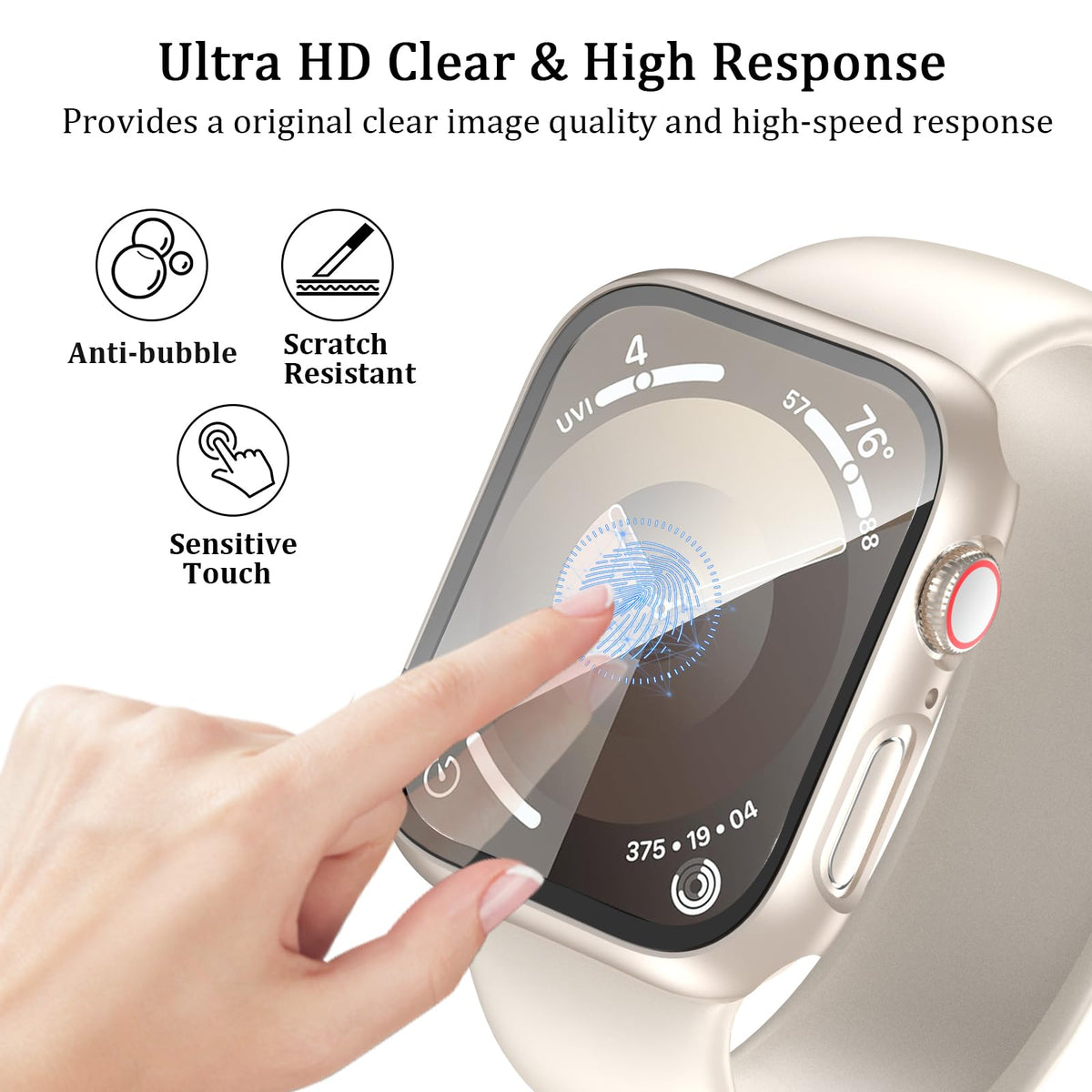 Q: How does the tempered glass screen protector work?A: The built-in 9H tempered glass screen protector offers high transparency and protects your Apple Watch screen from scratches, cracks, and bumps while maintaining touch sensitivity.