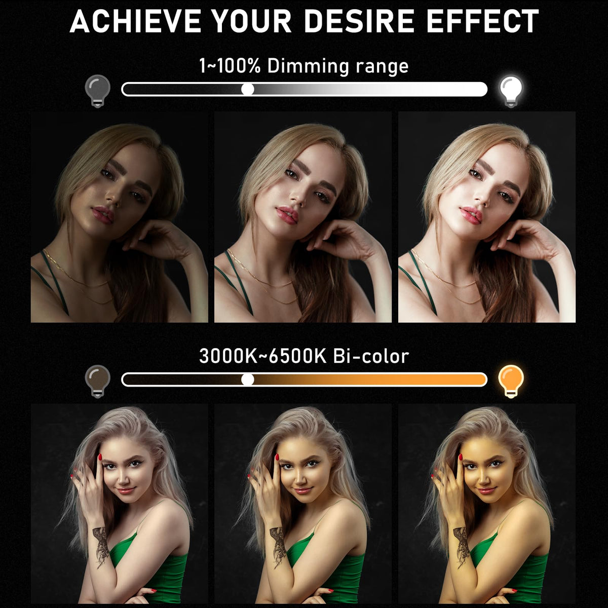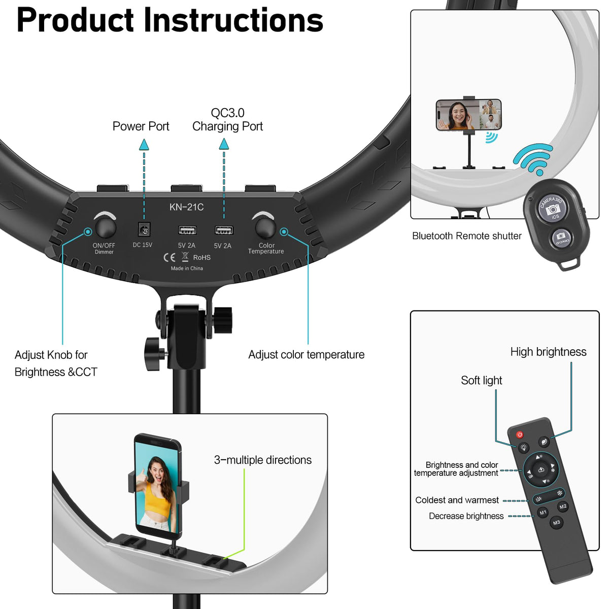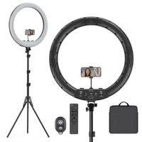 Ring Light With Stand: Our Light Ring Has Brightness And Color Temperature Adjustment Functions, And 416 Smd Leds Emit Excellent Light. Brightness From 0% To 100%; Color Temperature Adjustable From 3000K-6000K. To Meet Your Various Needs. It Has A Highly Responsive Touchpad To Control The Lights. More Convenient And Longer Life Than Traditional Mechanical Buttons. | Wireless Remote Control And Selfie Remote Control: You Can Directly Use The Wireless Selfie Bluetooth Controller To Take Pictures. Wireless Remote Control Provides Convenient Brightness And Color Temperature Settings, Channel/Group Selection, And Reliable, Accurate Real-Time Control Of Dimming Parameters. | Foldable And Sturdy Tripod: The Light Ring Tripod Is Made Of Aluminum Alloy And Is Sturdy And Durable. Comes With A Foldable Floor Stand, Very Portable, When Folded - 15.4 Inches Long, Fully Extended - 56 Inches, And Finally Connected With The Light Ring - About 71 Inches, Enough To Meet Your Different Needs. Its Compact Design Ensures Easy Portability. | With Usb Port & Versatility: It Is Compatible With Devices That Support Usb Ports And Also Comes With A Usb Charging Port (5V 2A) To Charge Your Smartphone While Live Streaming. It'S Perfect For Makeup, Photography, Live Streaming, Vlogging And Selfies And Can Even Be Used As A Fill Light, Floor Lamp Or Zoom Light. | Package Includes: 1* Ring Light Body, 1* Adapter, 1* Carrying Bag, 1* Instruction Manual, 1* Hose Clamp, 1* Remote Control,1*Bluetooth Remote Control.Note: Do Not Place The Photography Light In A Place With High Temperature Or High Humidity. Do Not Immerse Product In Water Or Expose To Rain.