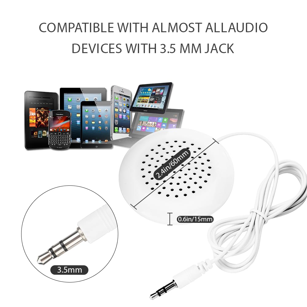 Description:This Is A Powerful Stereo Speaker With High-Quality Sound. With 3.5 Mm Plug, It'S Compatible With Most Audio Devices Such As Mp3, Mp4, Cd Player, Mobile Phone Etc. The Crystal Clear Mid &Amp; High Sound And Thumping Bass Enhance Musical Experience.&Nbsp;Features:1. Simply Put It Beside Your Pillow And Connect To Your Devices, Then You Can Enjoy Beautiful Music Without Disturbing Others.2. Great Compatibility: Compatible With Almost All Audio Devices With 3.5 Mm Jack Such As Mp3, Mp4, Cd Player, Mobile Phone Etc.3. It Gives Out Beautiful Music And Help You Sleep Well.4. Provides Impressive True Hd And Unique Soft Sound, Enhance Your Musical Experience.5. Fine Workmanship And Exquisite Appearance. Light Weight And Easy To Carry.Specifications:Material: Abscolor: Whitecommunication: Wiredbuilt-In Battery: Nosupport Memory Card Reader: Nodiameter: 60Mm / 2.4Inthickness: 15Mm / 0.6Inweight: Approx. 20Gpackage List:5 * Speaker