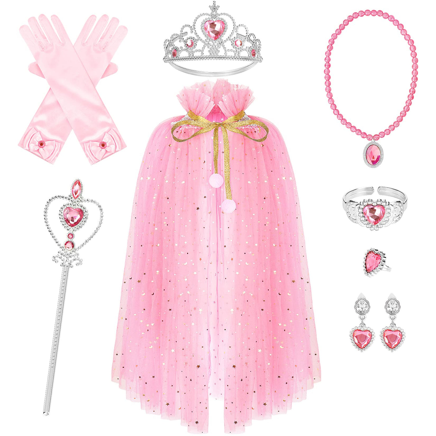 Hapgo Princess Cape Set 9 Pieces Girls Princess Dress Up Party Cosplay Cloak With Jewelry Tiara Crown Wand Gloves (Pink)