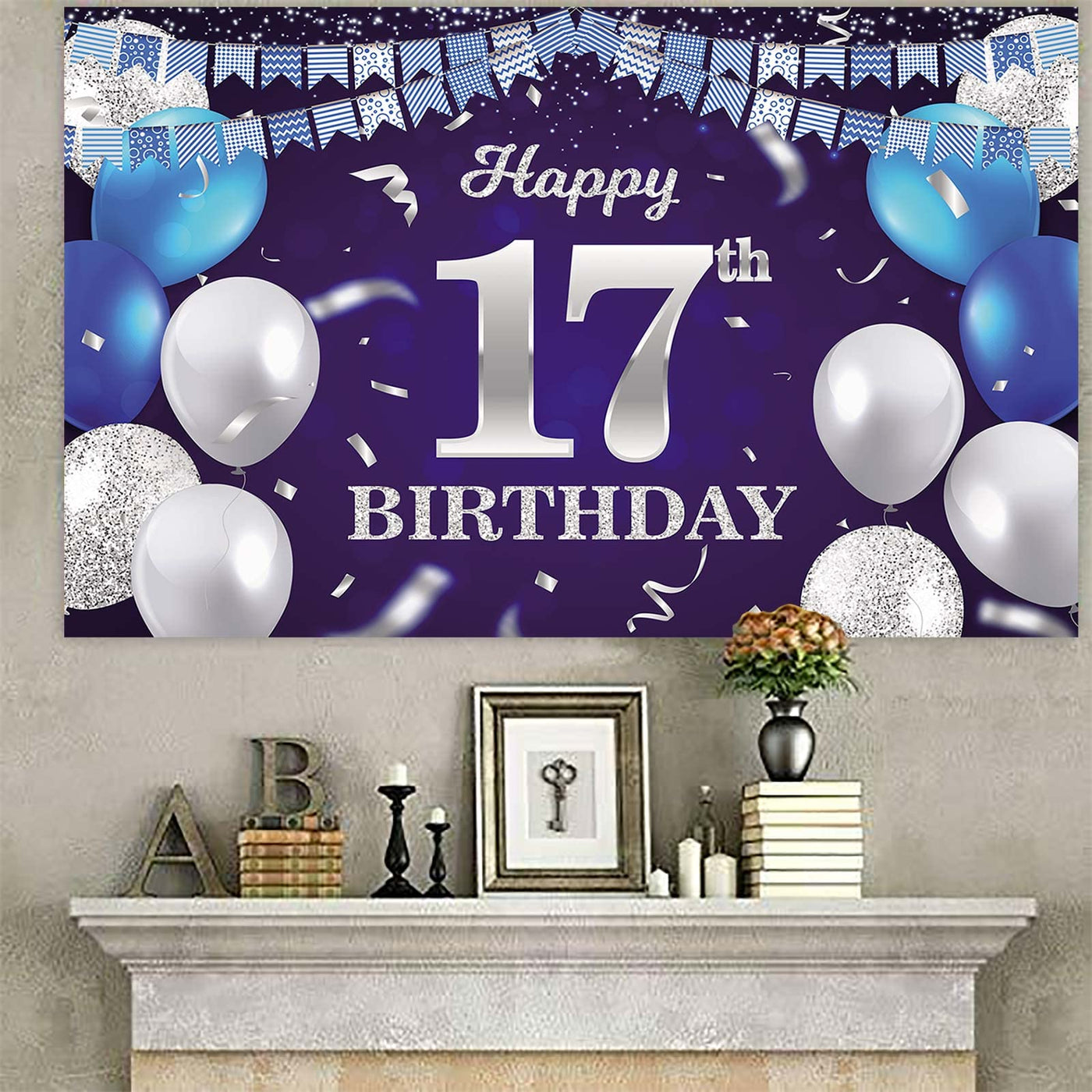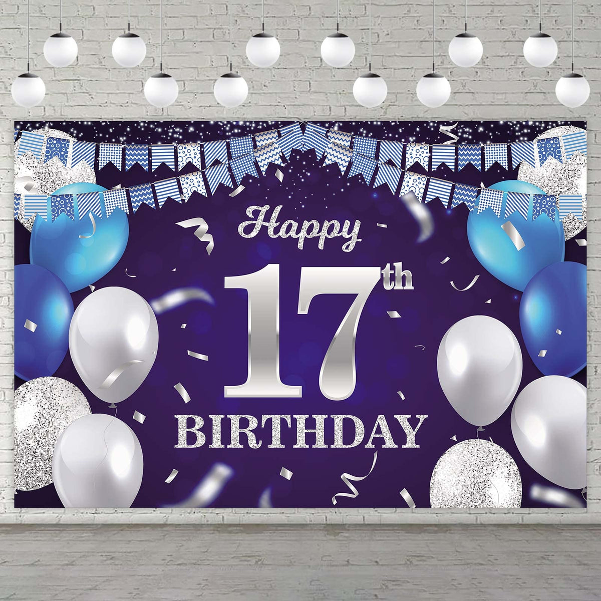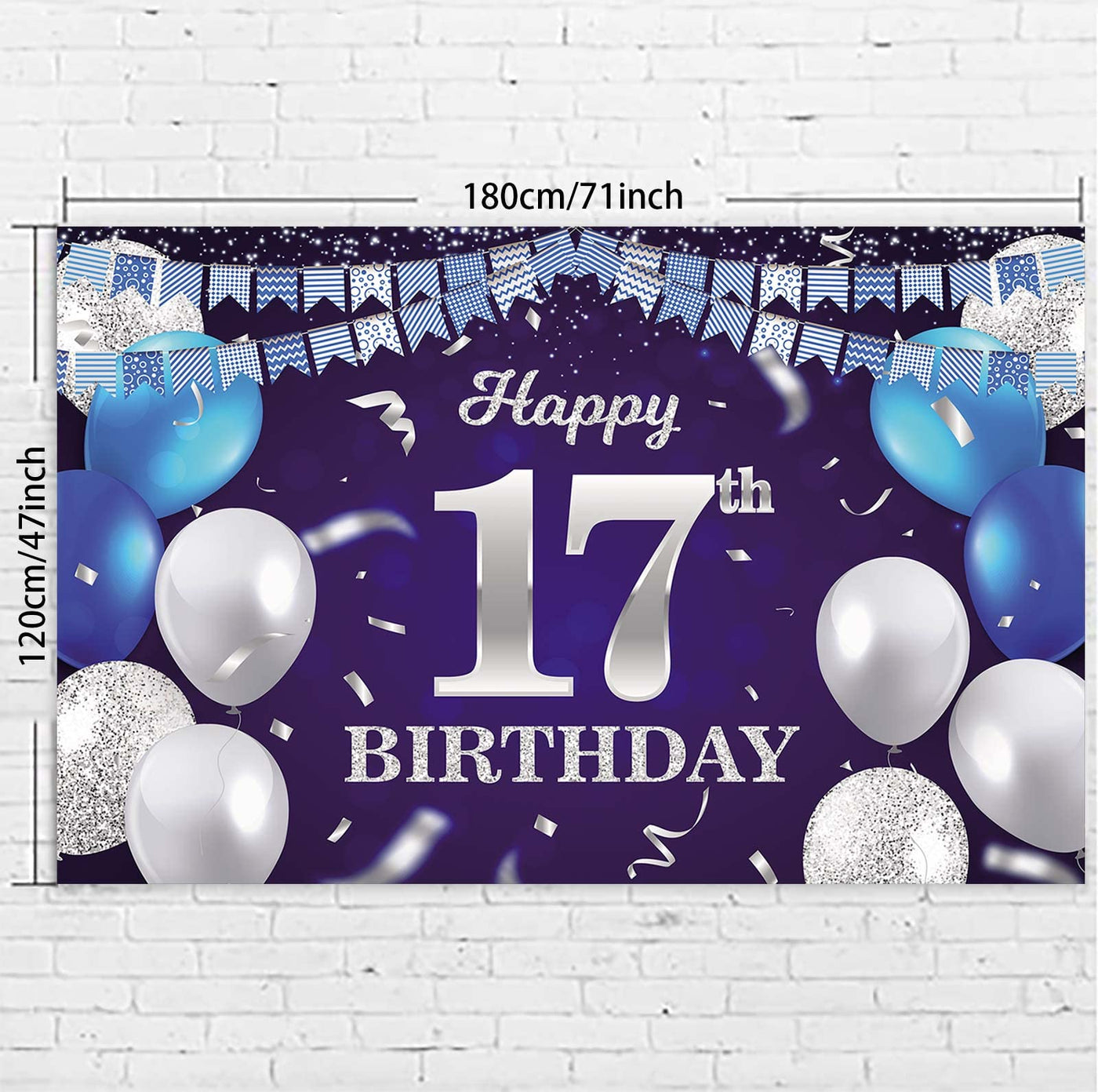 Happy 17Th Birthday Banner Backdrop Navy Blue Balloons Confetti Stripe Flag Light Spots Cheers To 17 Years Old Theme Decorations