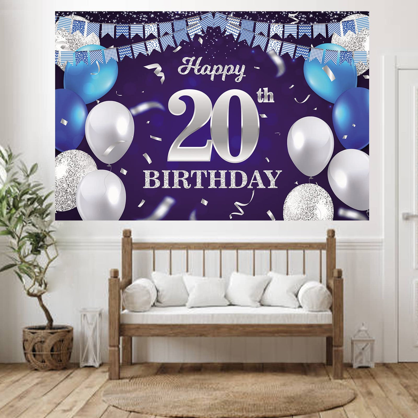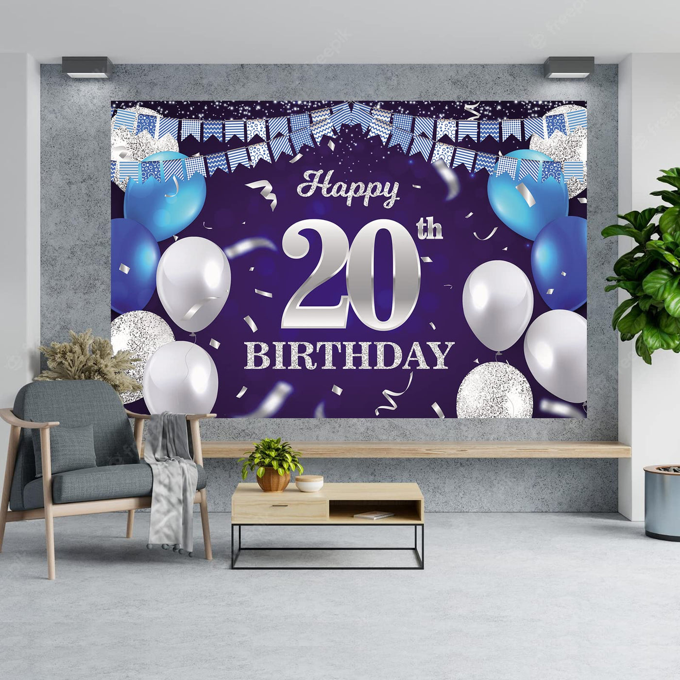 Happy 20Th Birthday Banner Backdrop Navy Blue Balloons Confetti Stripe Flag Light Spots Cheers To 20 Years Old Theme Decorations