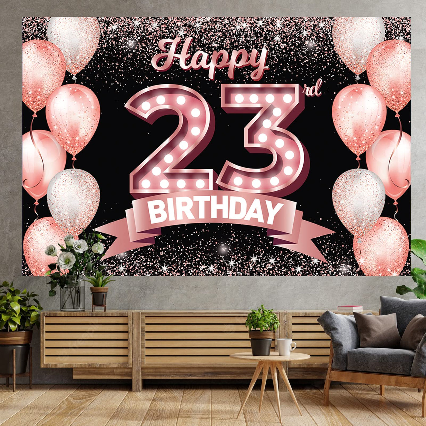 Q: What are the dimensions of the Happy 23rd Birthday Rose Gold Banner?A: The dimensions of the Happy 23rd Birthday Rose Gold Banner are 71 inches in width and 47 inches in height, making it a substantial backdrop for your party decorations.