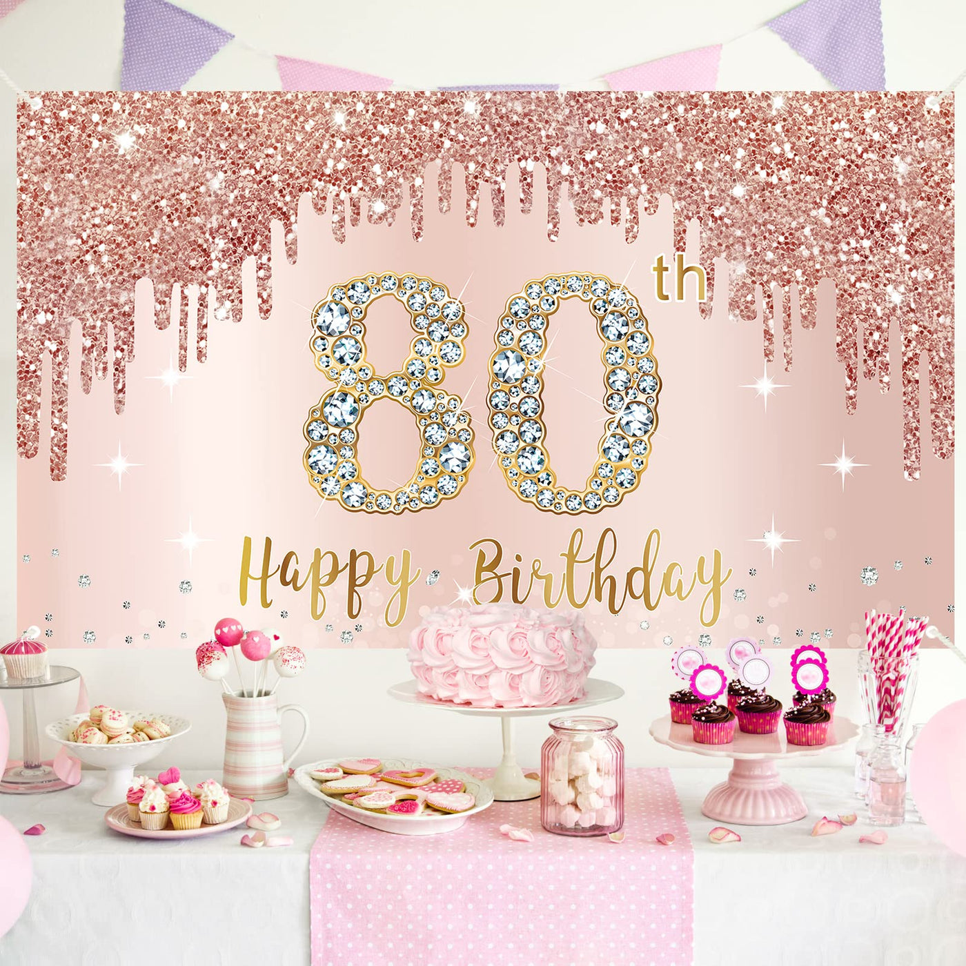 Happy 80Th Birthday Banner Backdrop Decorations For Women, Rose Gold 80 Birthday Party Sign Supplies, Pink 80 Year Old Birthday