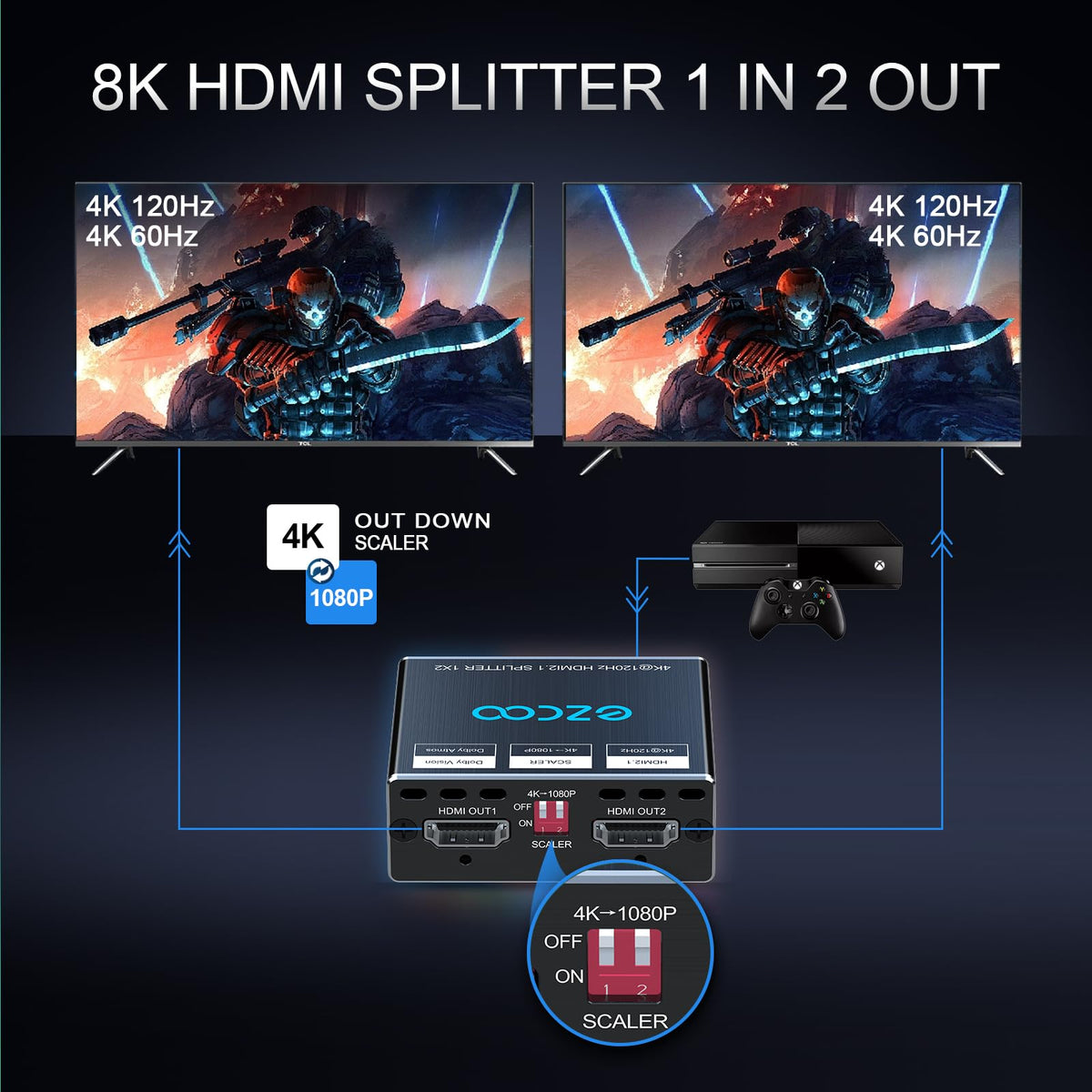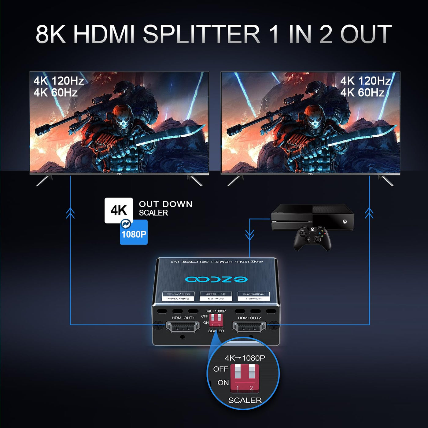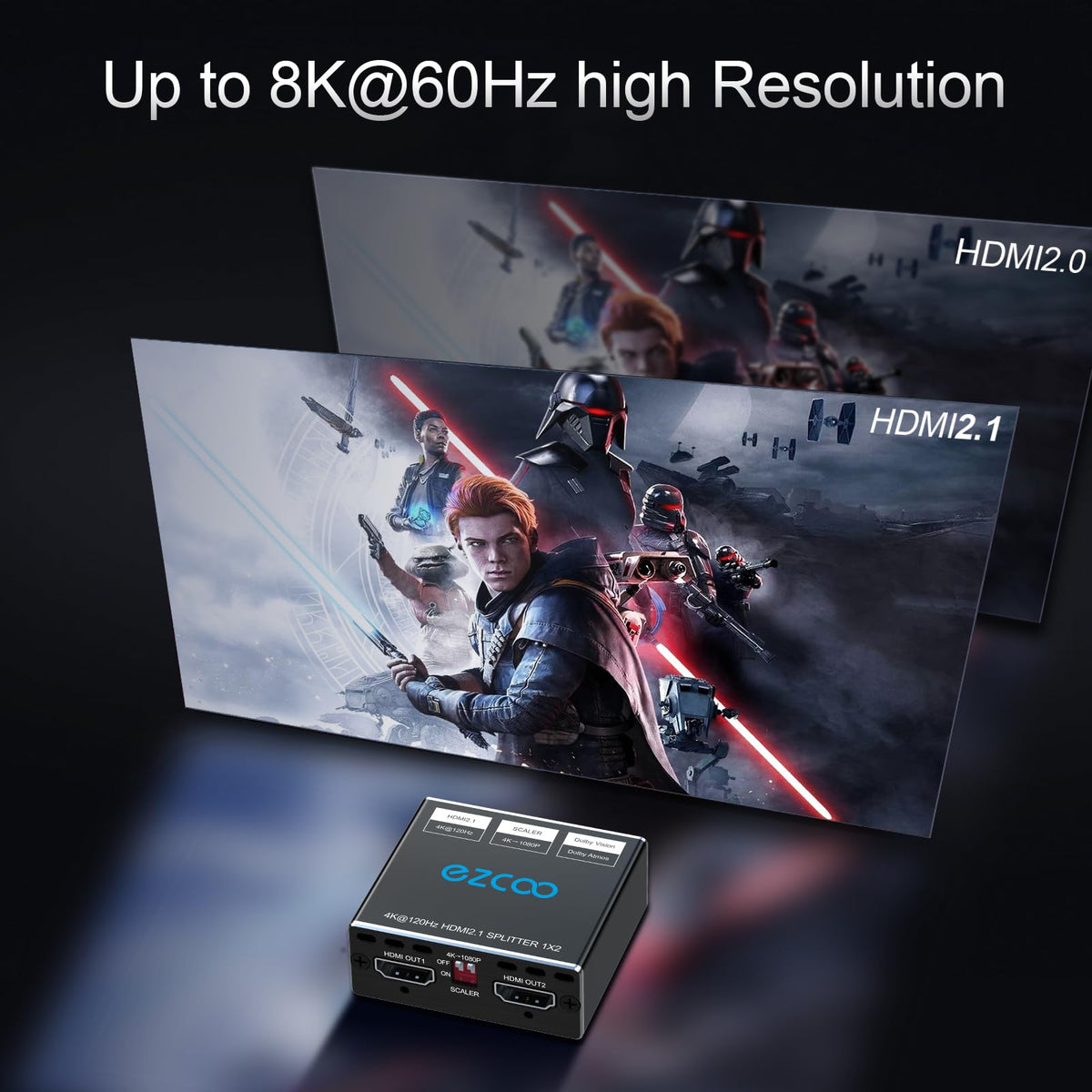 Q: What resolutions does the HDMI 2.1 Splitter support?A: The HDMI 2.1 Splitter supports multiple resolutions, including 8K@60Hz, 4K@120Hz, 5120x1440@120Hz, and 1080P@240Hz, making it ideal for high-definition video output.