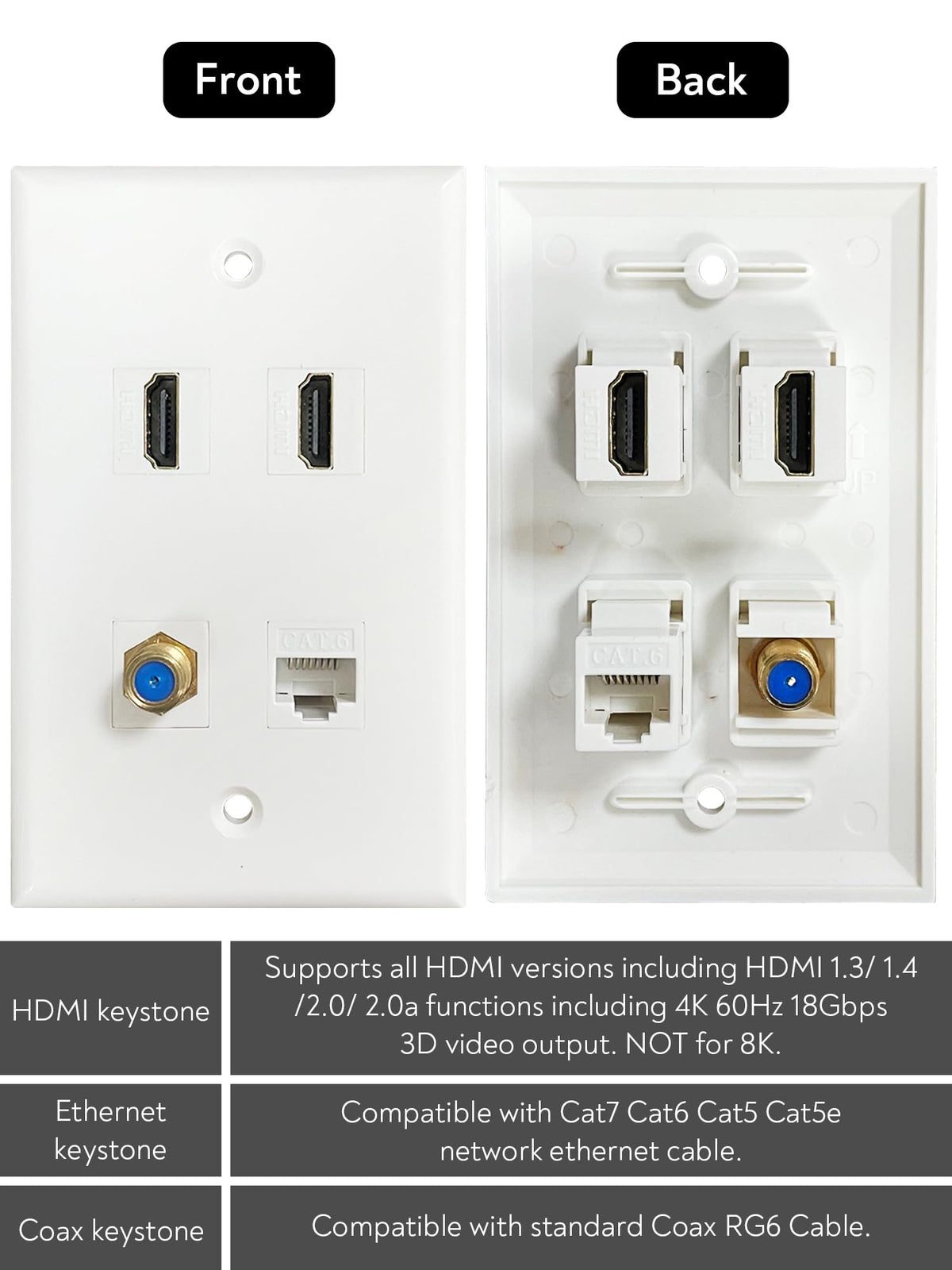 Hdmi Coax Ethernet Wall Plate, 2 Port 4K Hdmi Keystone Female To Female, 1 Port Coax Keystone Female To Female, 1 Port Cat6 Keys