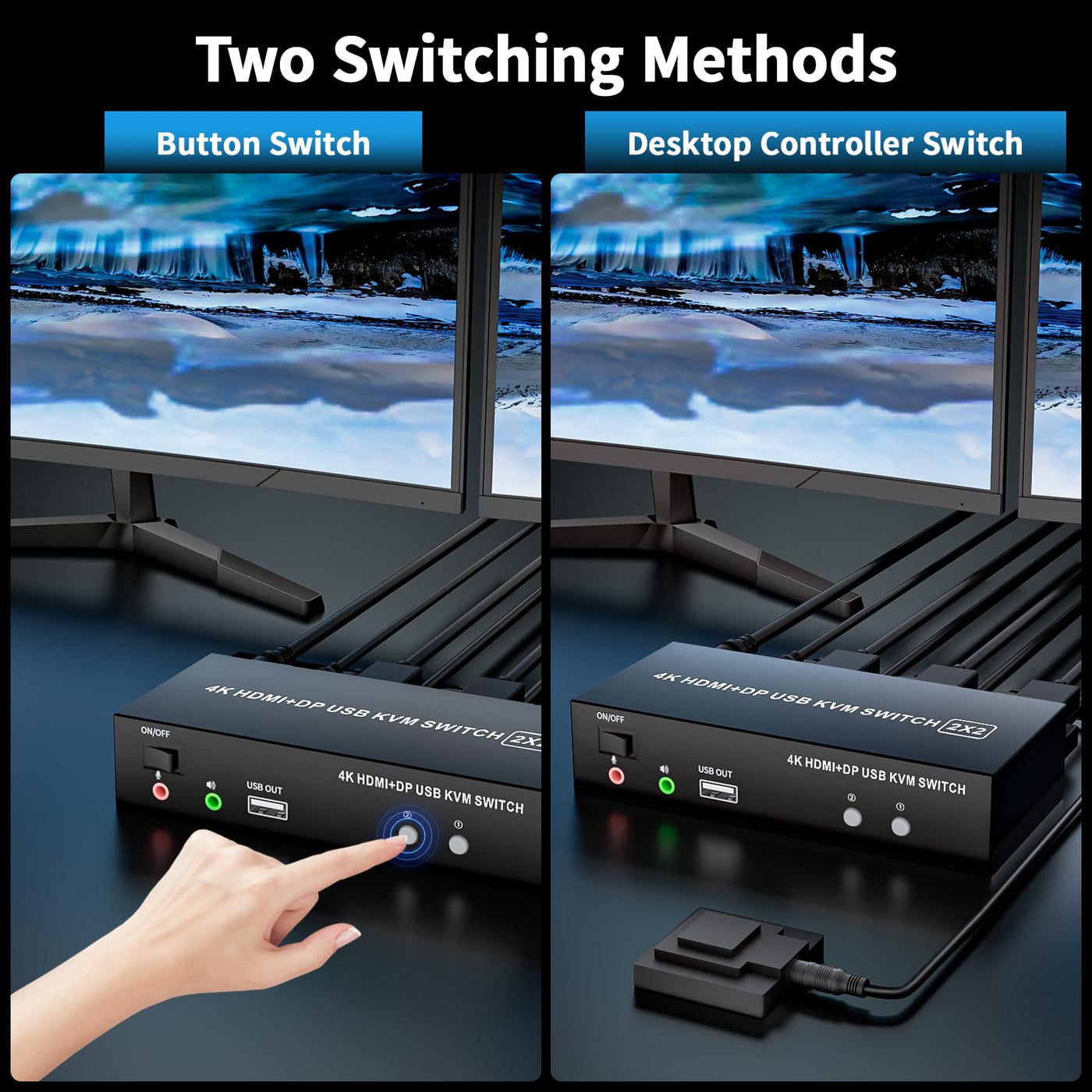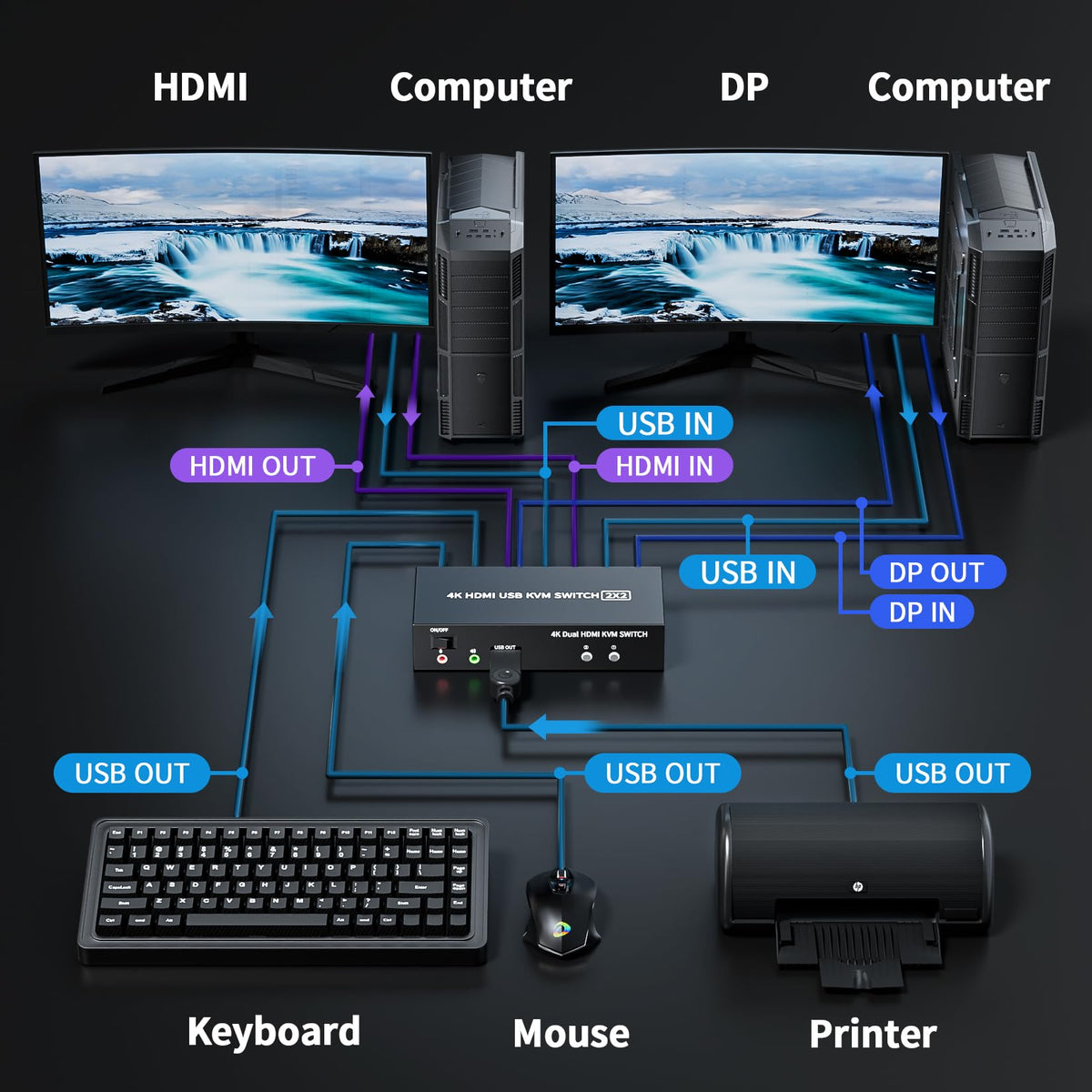 Q: What are the main features of the HDMI Displayport KVM Switch?A: The HDMI Displayport KVM Switch allows you to control two computers with one set of keyboard and mouse. It supports dual monitor setups in extended or mirror mode, with a maximum resolution of 4K@60Hz. Additionally, it provides multiple USB 2.0 ports for connecting printers and other peripherals.