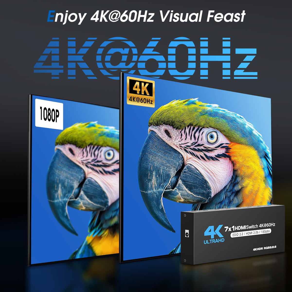 7 In 1 Out Hdmi Switch Upgrade Version-7 Port Hdmi Switch Selector Is Your Perfect Choice For Video And Audio Signals In 4K@60Hz With Lossless Transmission.Specification:1. 4K 60Hz Ultra Hd Resolution - 4K@60Hz Uhd Signal (Also Backward Compatible With 1080P/720P/576P/480P) Input And Output.2. Three Switching Ways - Manually Switch With The Select Button Or The Ir Remote. Automatically Switch To The New Active Hdmi Input.3. Ite High-Performance Chip Makes The Hdmi Switch More Stable.4. Supports Audio Formats Such As Dts-Hd, Dolby Truehd, Dts, Dolby Digital Ac3.5. Supports 3D.6. Supports Hdmi 2.0 And Hdcp 2.2 And Lower.7. Supports 36Bit Deep Color Per Channel.8. Supports The Mhl Function With Led Indicators.How To Switch?1. Ir Remote Switch: Hdmi Switch With Remote Lets You Easily Control Hdmi Switcher (Turn On/Off, Switch Signals) Within 23Ft, Switch The Hdmi Sources Without Leaving Your Comfortable Seat.2. Manual Switch:The Hdmi Selector Allow You To Press The Switch Button To Choose Whichever Hdmi Input You Want.3. Auto Switch: Hdmi Switcher Hub Supports Auto-Switch To The Currently Active Input.Notes:1. To Enjoy 4K Hdr Video, Make Sure All Your Devices Support 4K Hdr, And You May Need To Adjust The Video Setting Of Devices.2. It Doesnt Support Cec, Please Turn Off The Cec Function Of Your Devices If There Is A Conflict.Package Includes:1 X Hdmi Switcher 7 In 1 Out1 X 5V Dc Power Adapter1 X Remote Control1 X User Manual