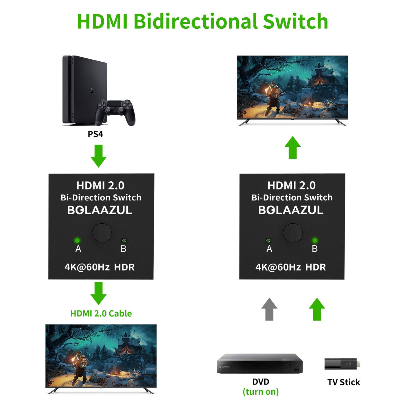 Hdmi Switch Splitter 4K@60Hz, Bolaazul Bi Directional Hdmi 2.0 Splitter Switcher 1 In 2 Out/2 In 1 Out Hdmi Switch 2 Port Displa