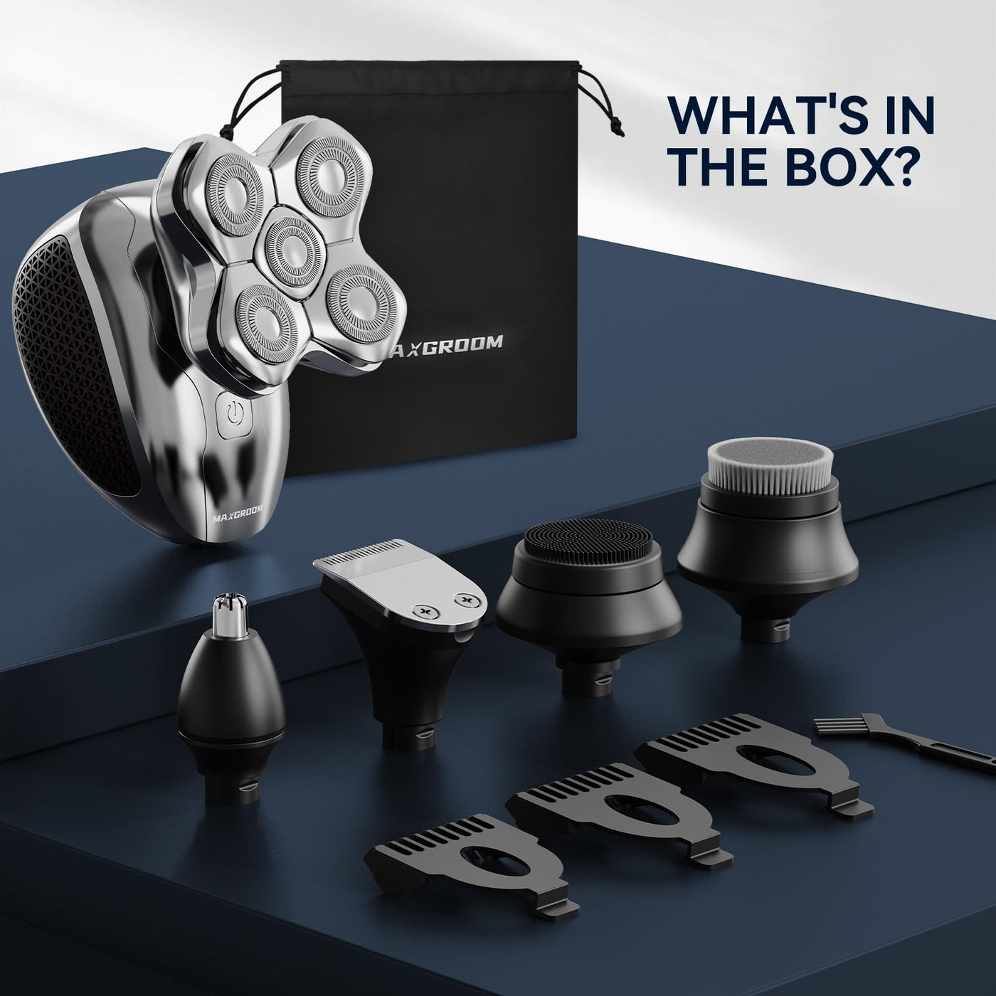 Q: What accessories come with the MAXGROOM 5-in-1 grooming kit?A: The MAXGROOM grooming kit includes a rechargeable head shaver, a precision hair trimmer, a nose trimmer, three guide combs (3/5/7mm), a face cleaning brush, and a head massaging brush. This multifunctional kit meets all your daily grooming and cleaning needs.