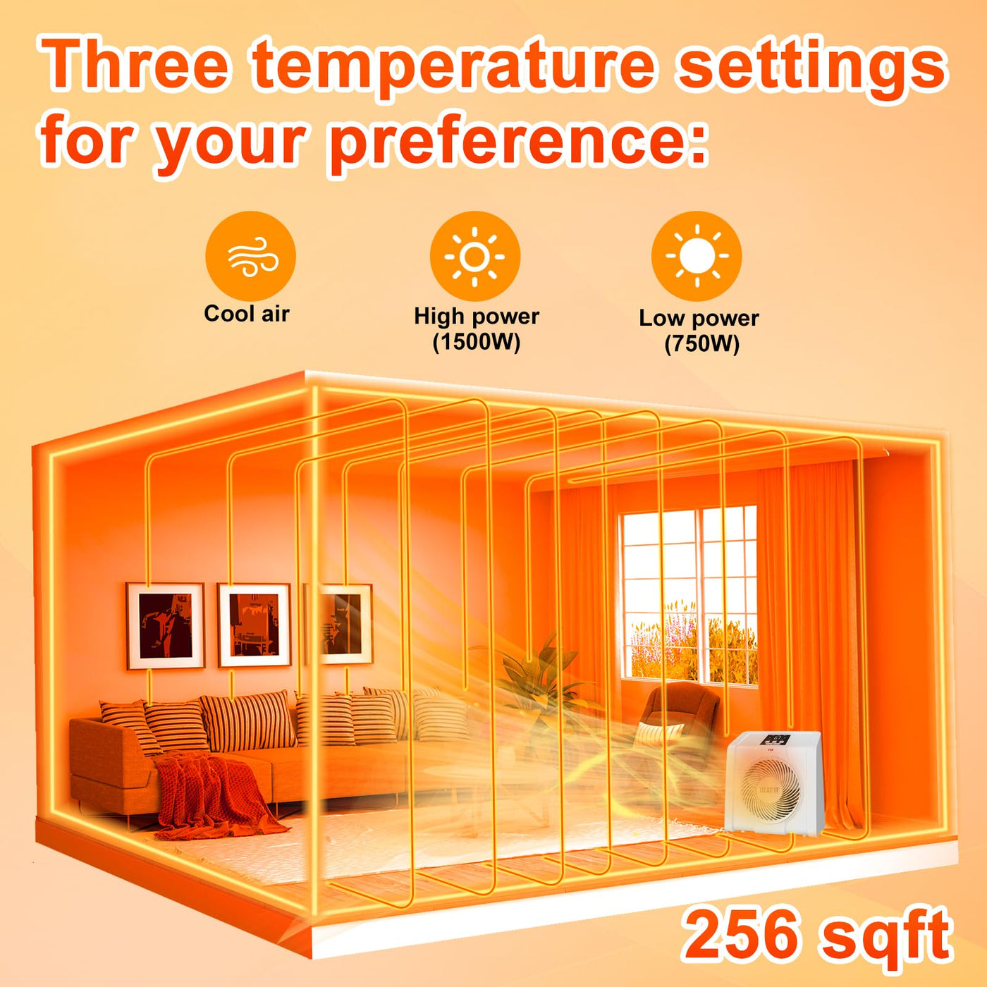 Q: What is the heating coverage area of the HEATIT Space Heater?A: The HEATIT Space Heater is designed to efficiently heat spaces up to 256 square feet, making it suitable for medium to small-sized rooms such as bedrooms, living rooms, kitchens, and offices.